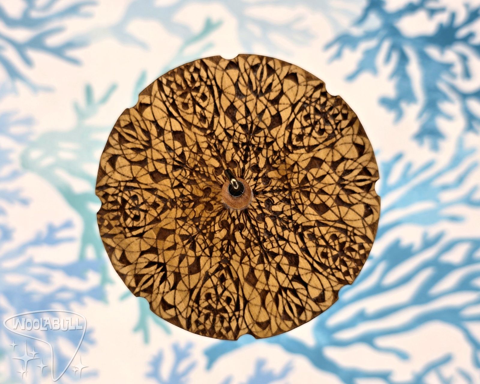 Each Drop Spindle is hand made from laser cutting my designs onto the front and back of 1/4" thick poplar wood, shaping the hardwood dowels, and shaping the hook.