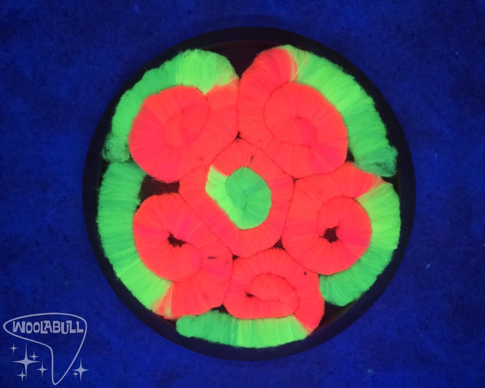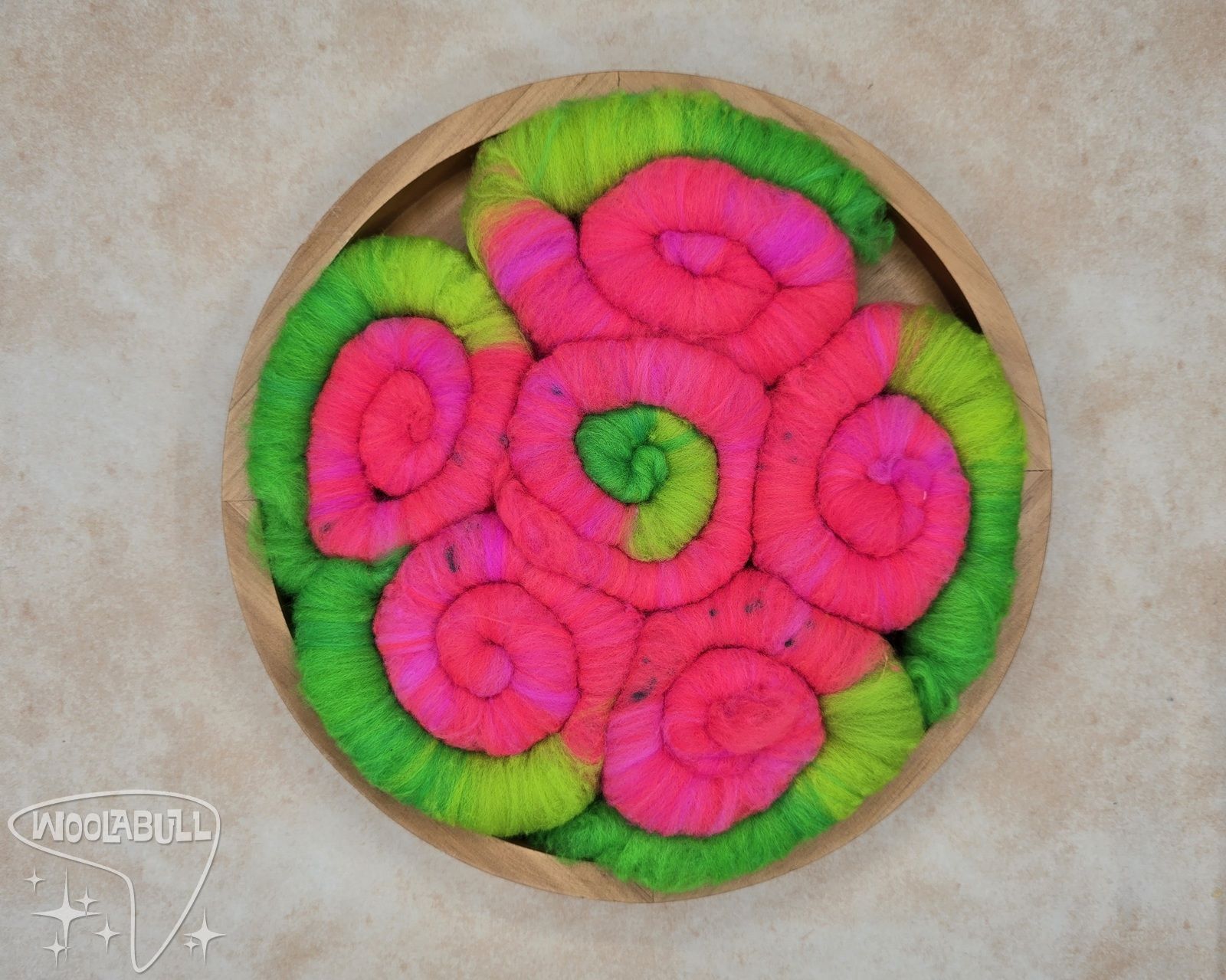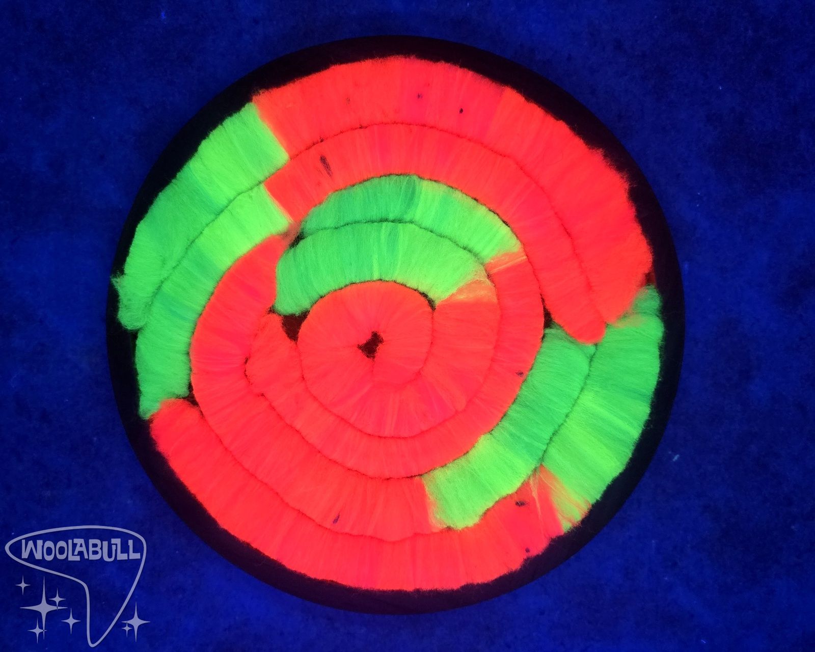 Spin your own melon inspired yarn that will shock and awe under a blacklight! A refreshing blend of neon colors with wool nub seeds that will be just as fun to spin as it is to look at!