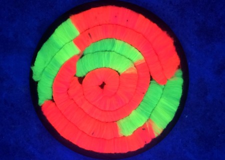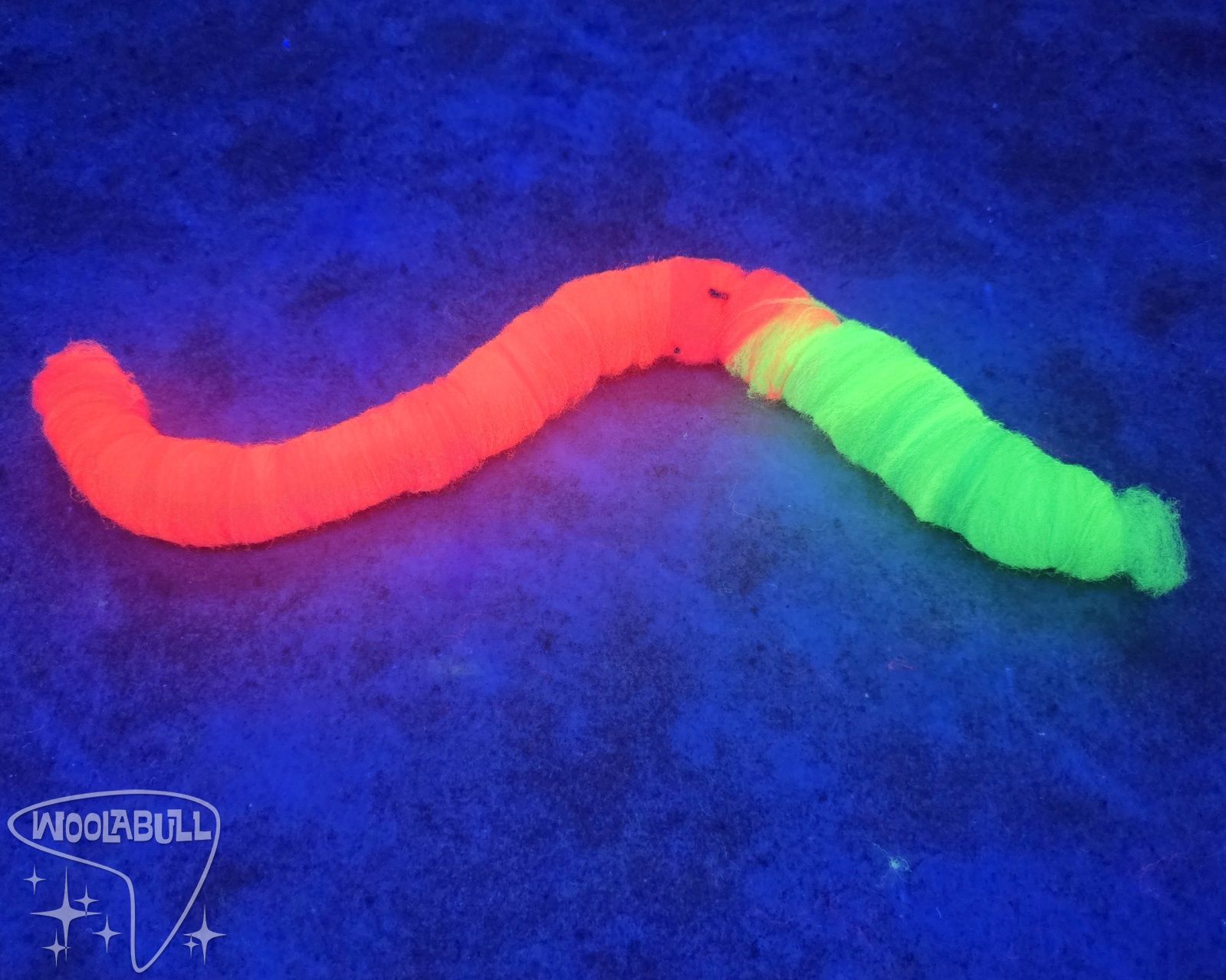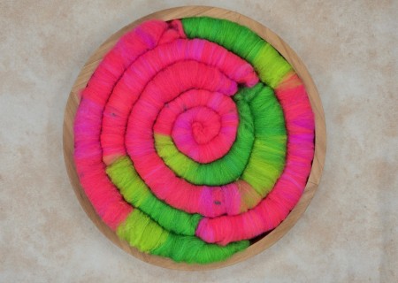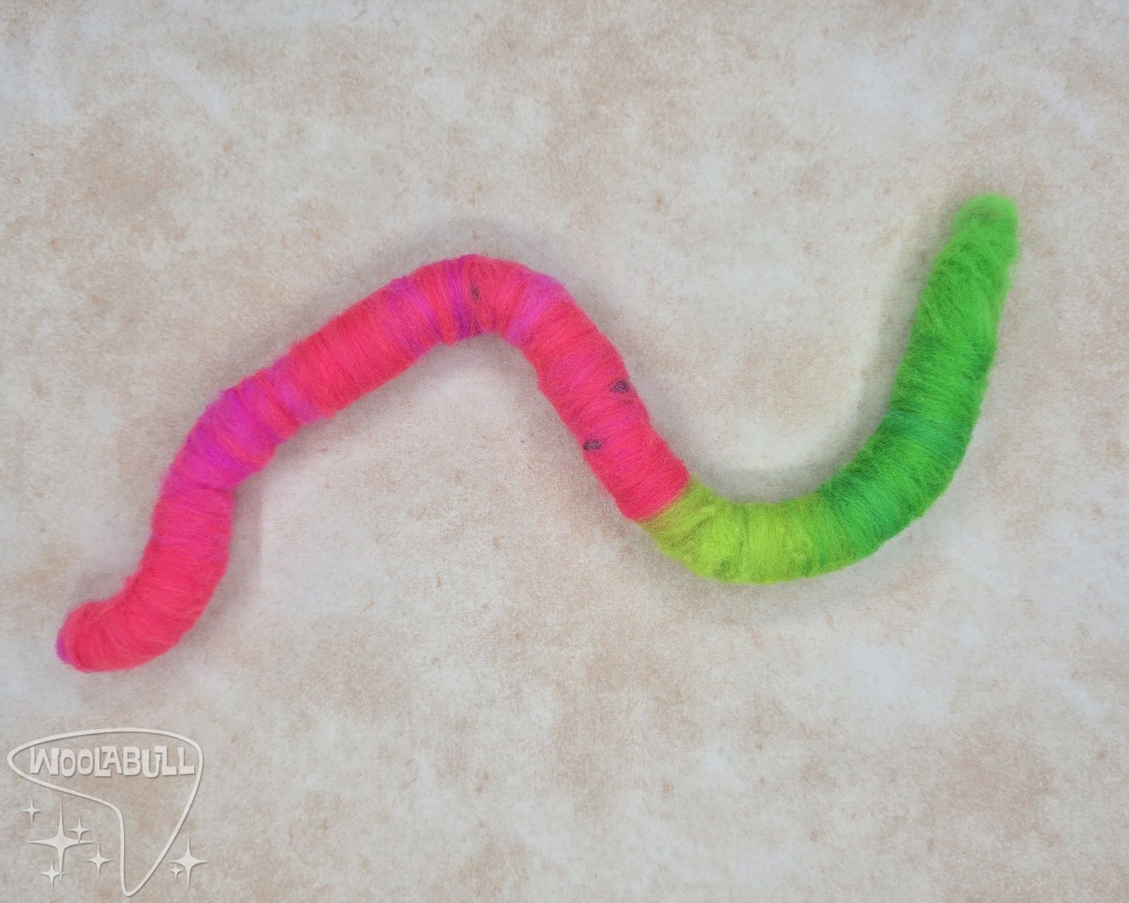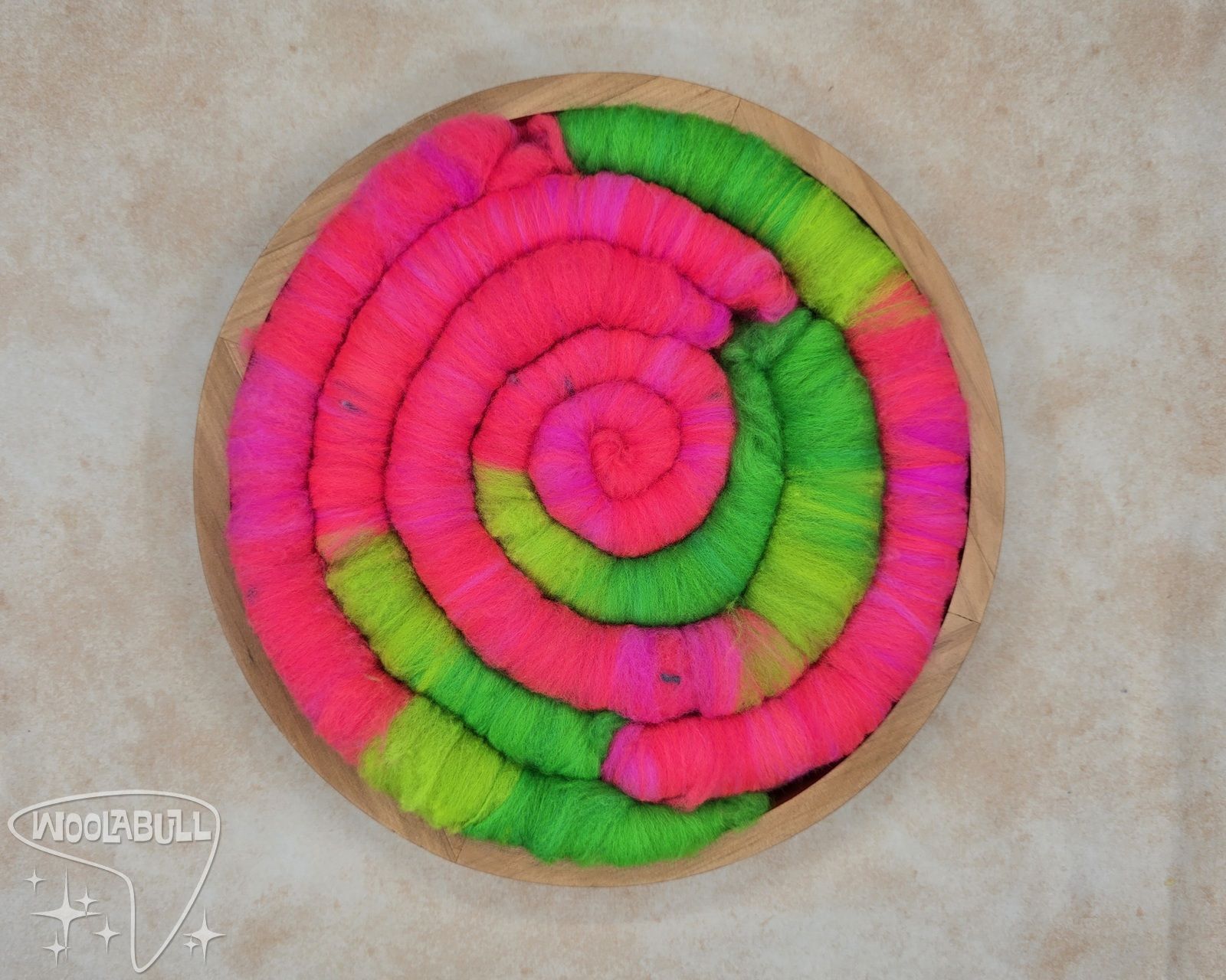 Spin your own melon inspired yarn that will shock and awe under a blacklight! A refreshing blend of neon colors with wool nub seeds that will be just as fun to spin as it is to look at!
