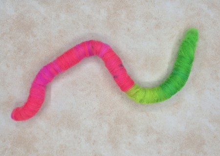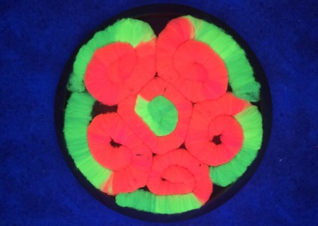 These rolags have a neon glow to them under blacklight as I used fluorescent dye!