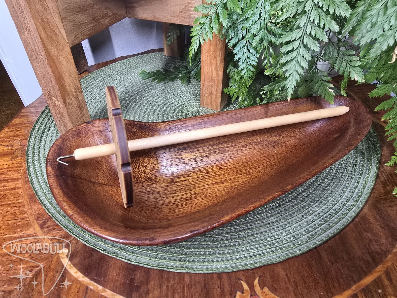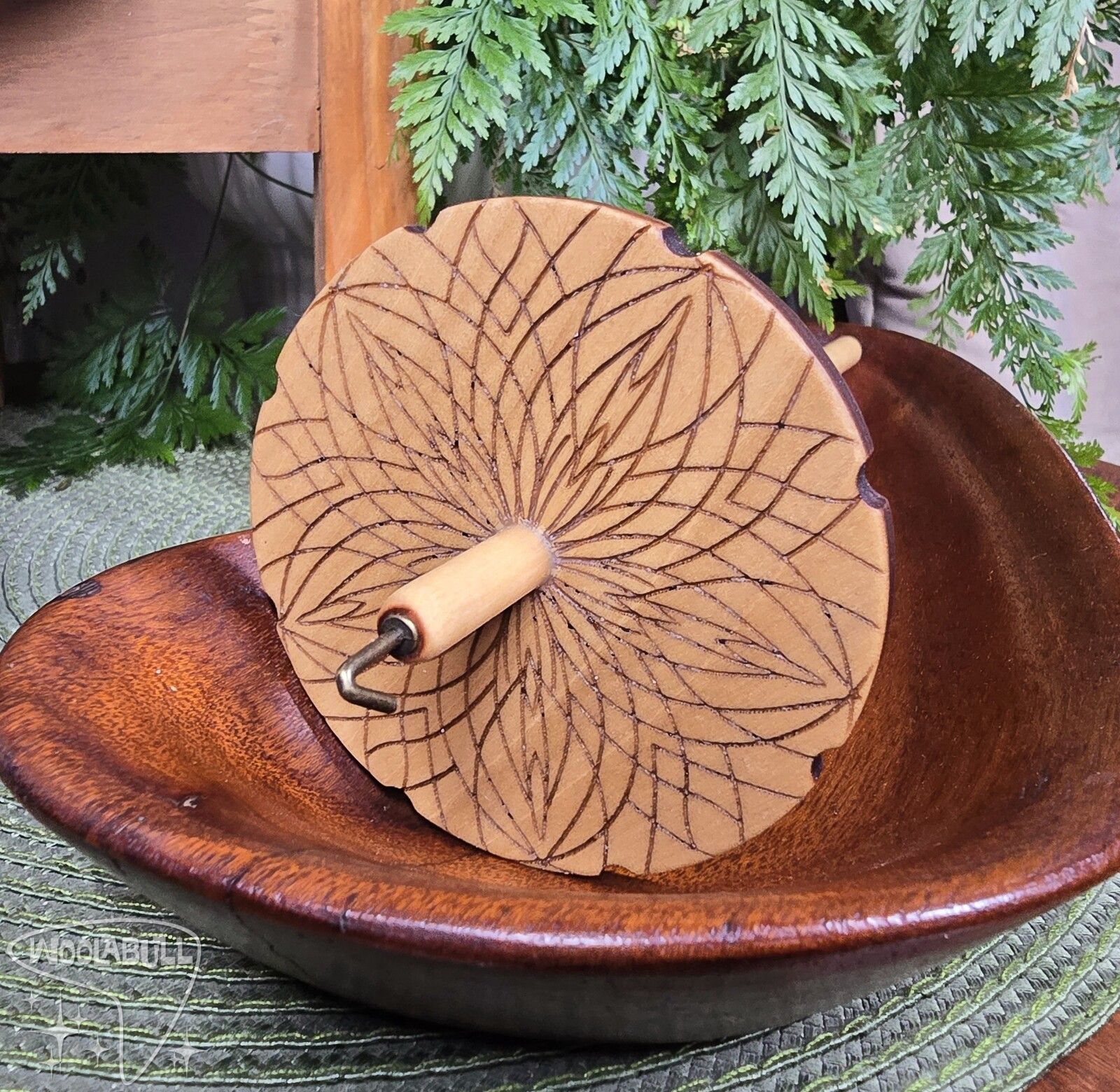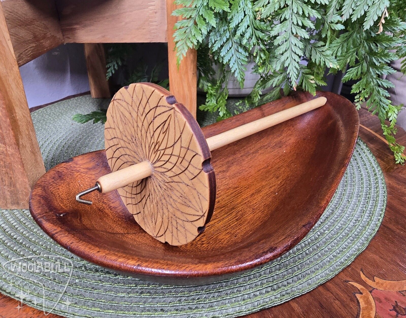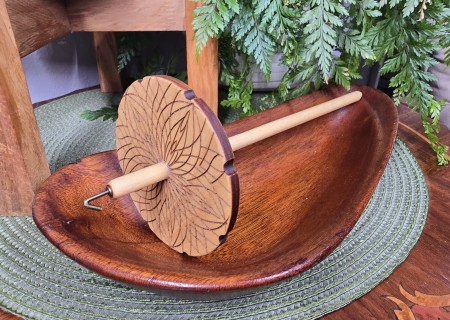 Each Drop Spindle is hand made from laser cutting my designs onto the front and back of 1/4" thick poplar wood, shaping the hardwood dowels, and shaping the hook.