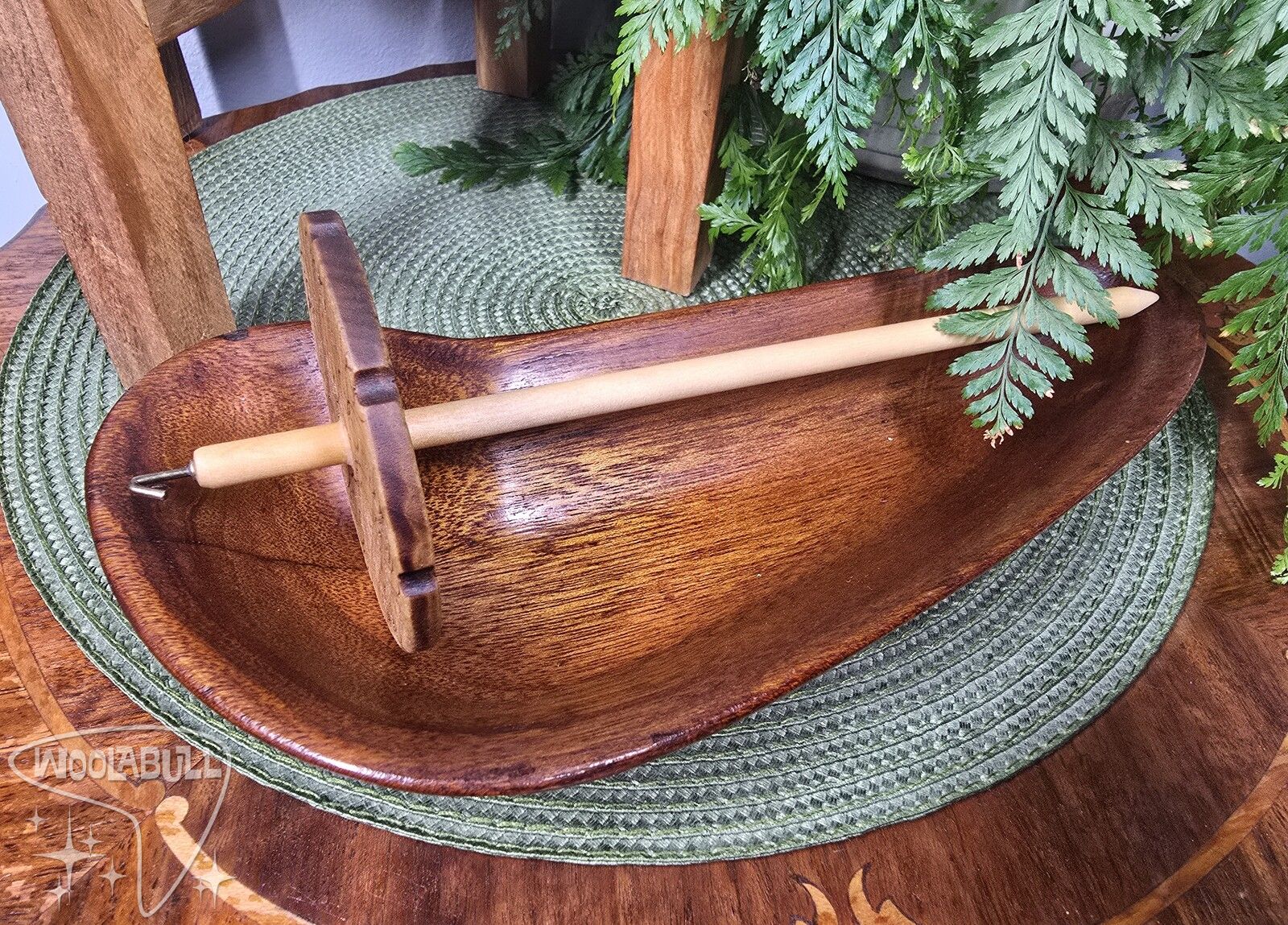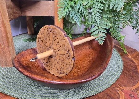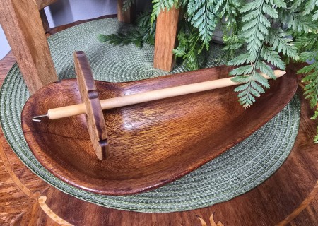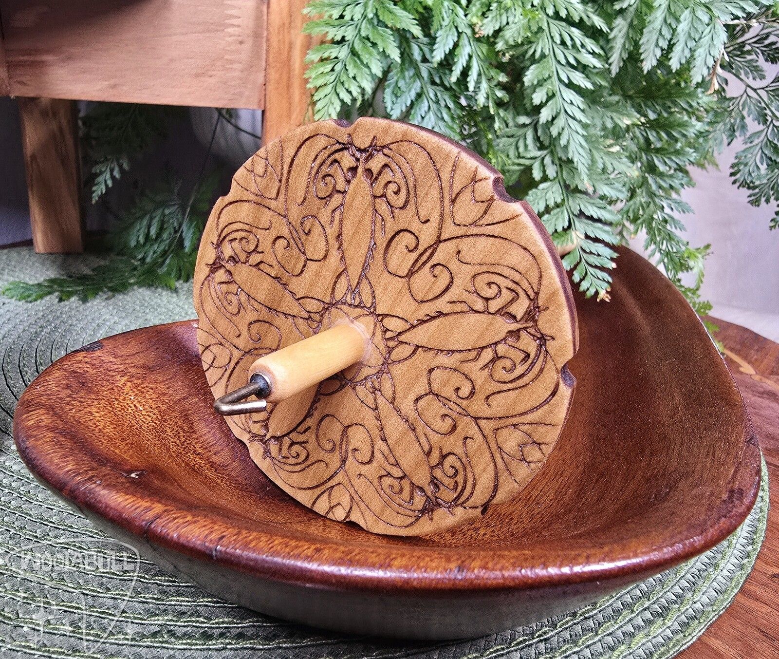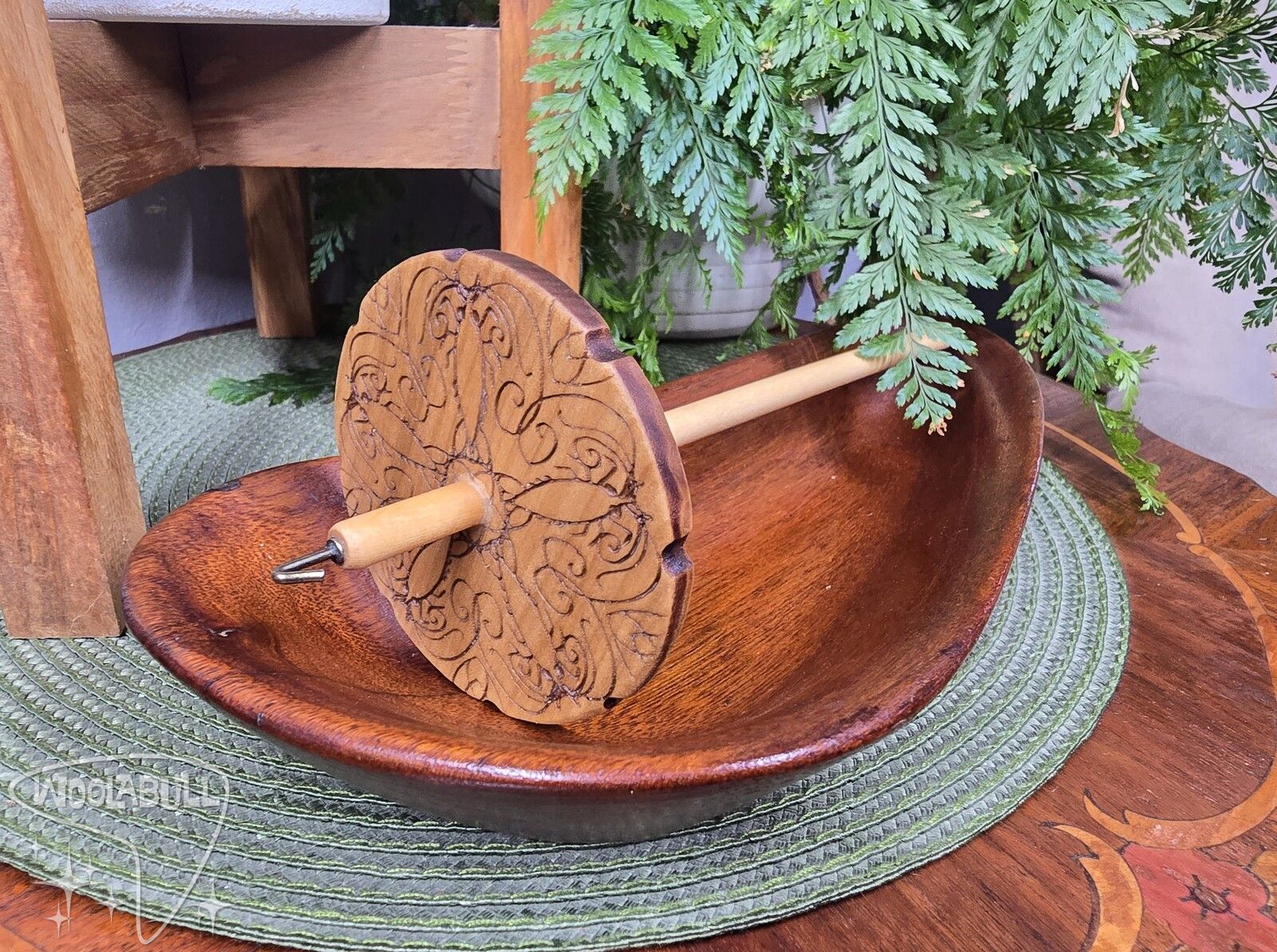 Each Drop Spindle is hand made from laser cutting my designs onto the front and back of 1/4" thick poplar wood, shaping the hardwood dowels, and shaping the hook.