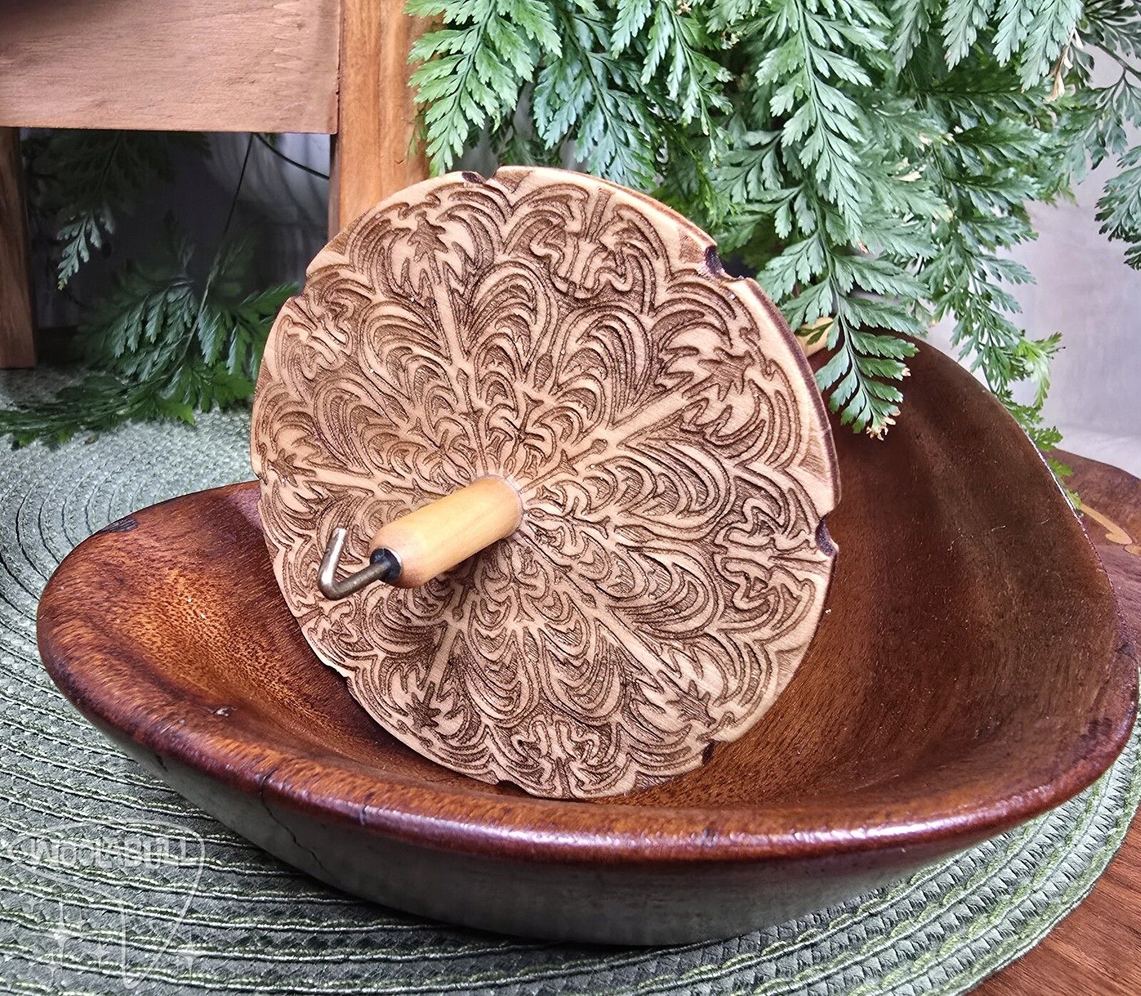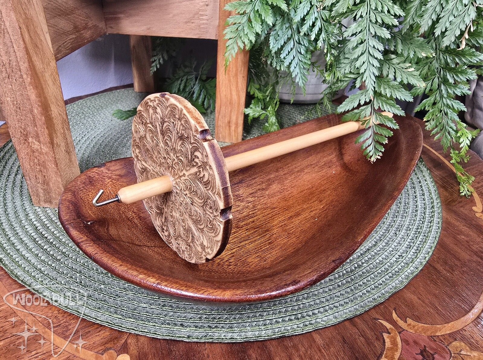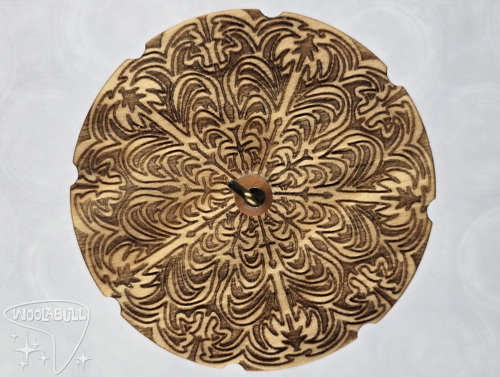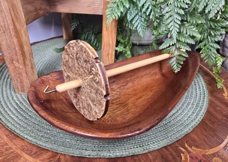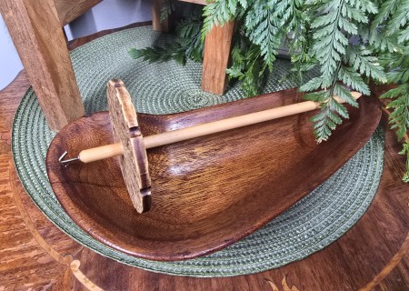 Each Drop Spindle is hand made from laser cutting my designs onto the front and back of 1/4" thick poplar wood, shaping the hardwood dowels, and shaping the hook.