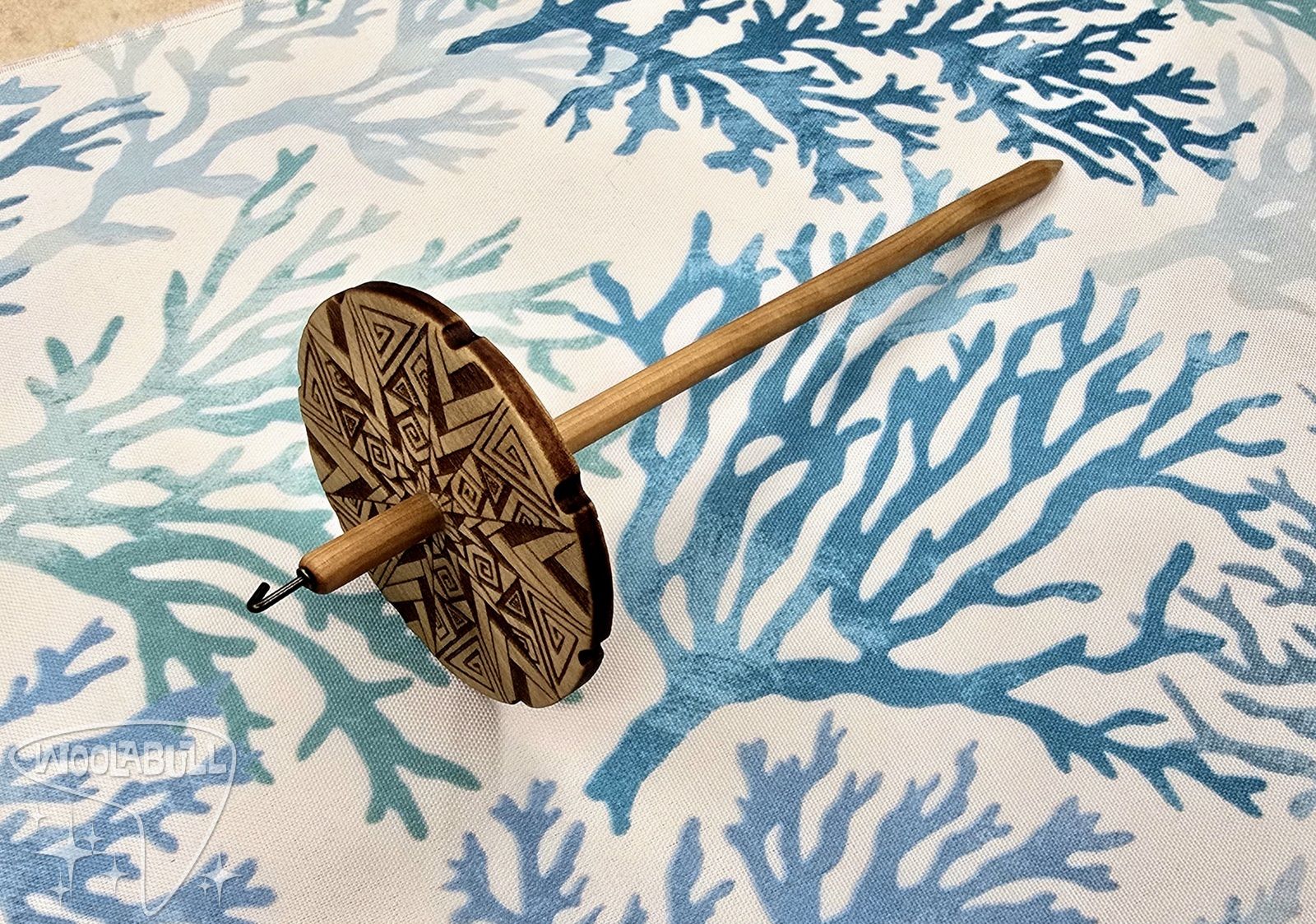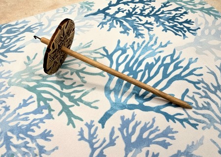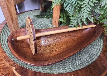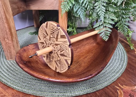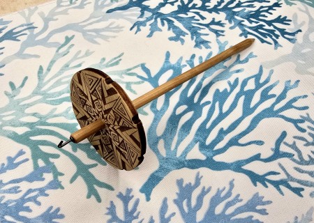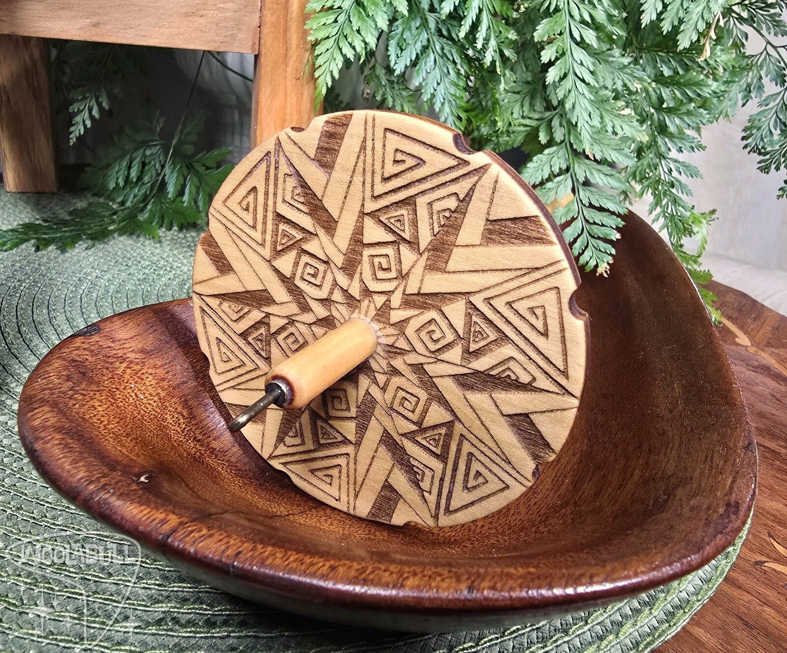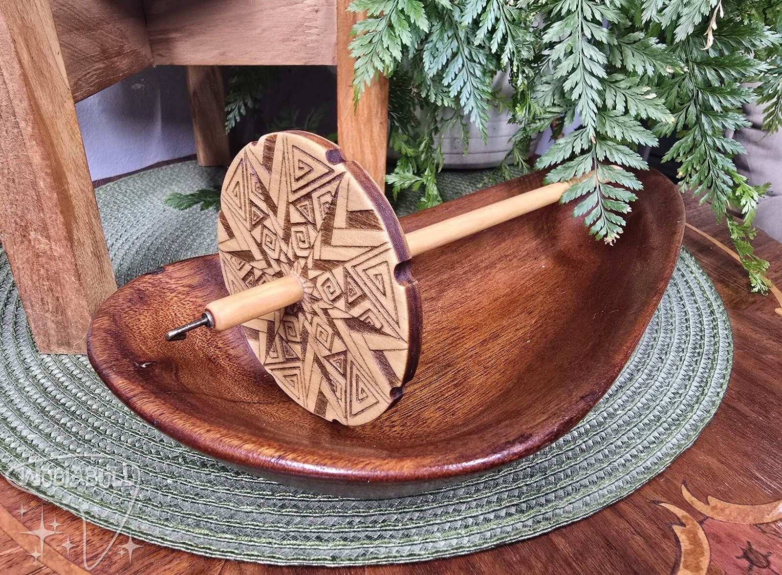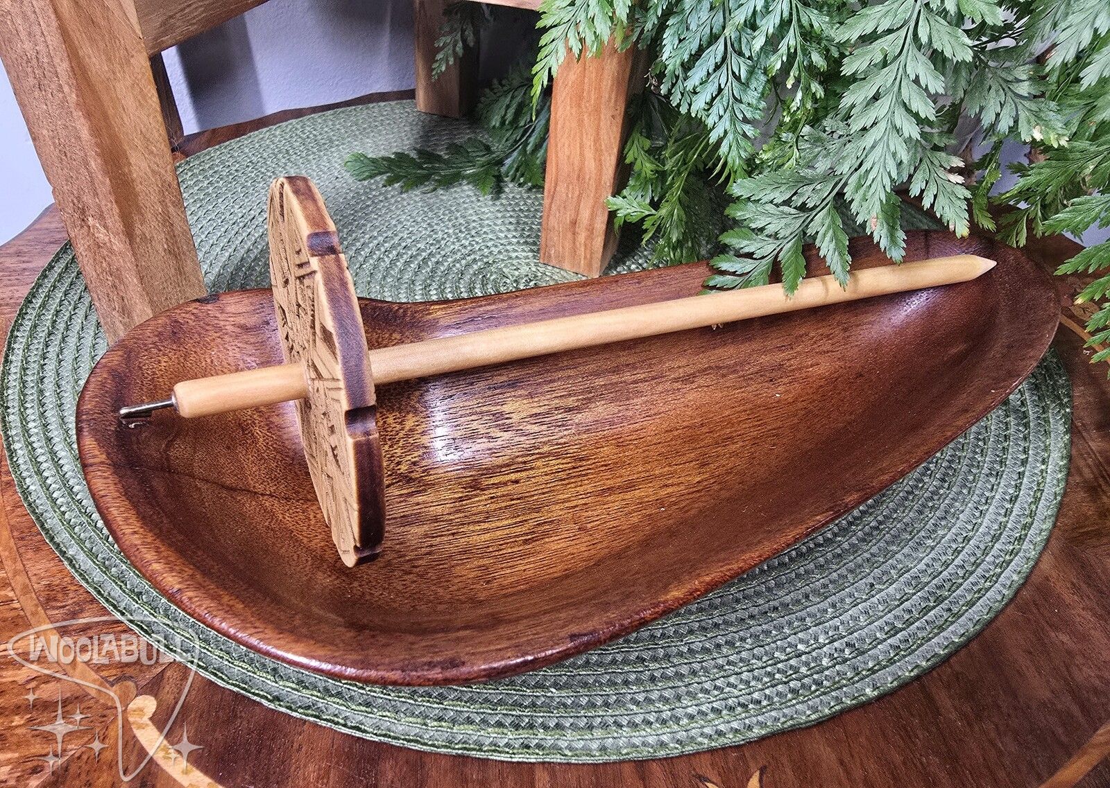Each Drop Spindle is hand made from laser cutting my designs onto the front and back of 1/4" thick poplar wood, shaping the hardwood dowels, and shaping the hook.