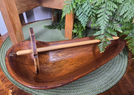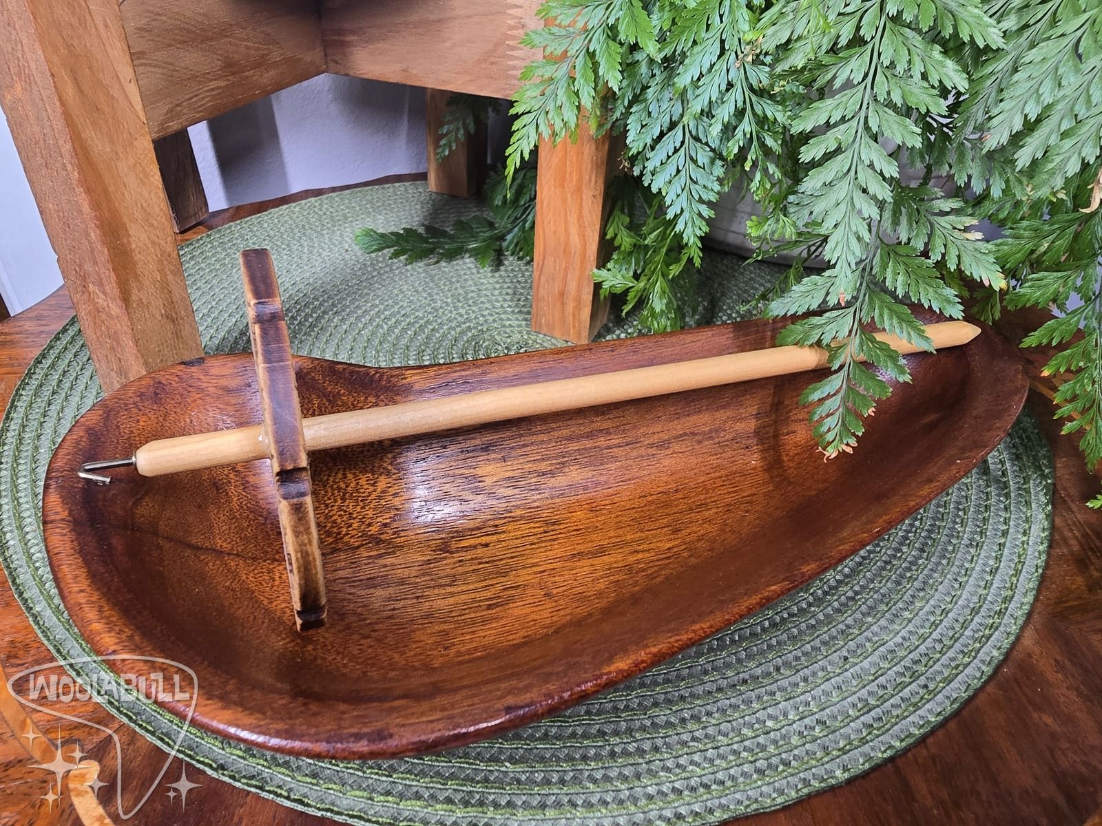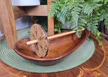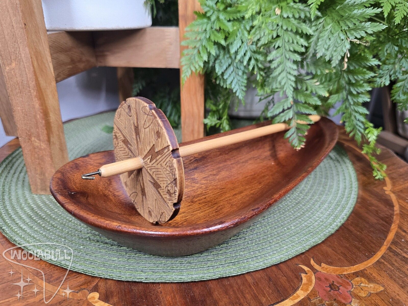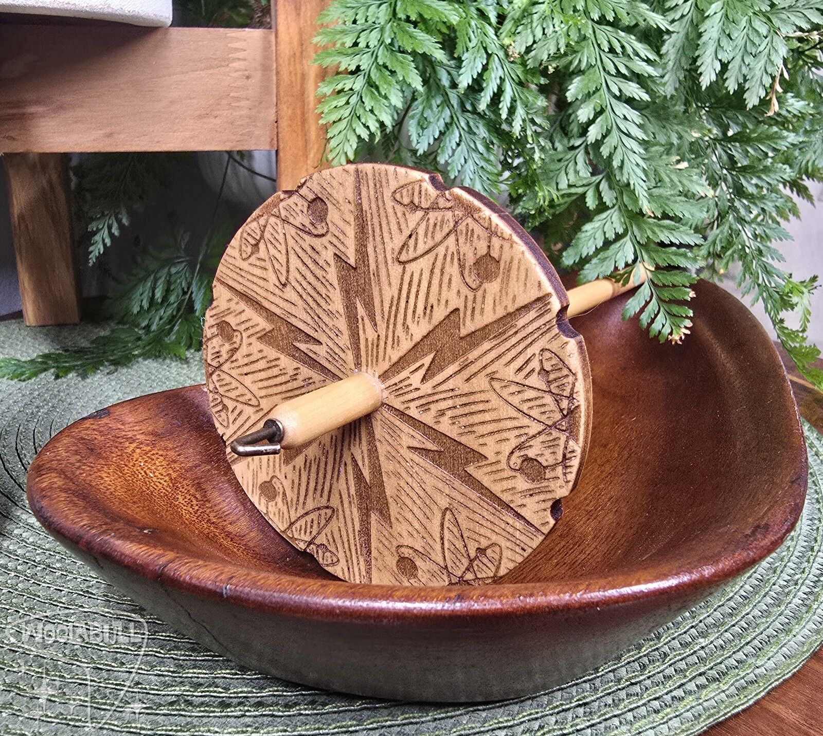 Each Drop Spindle is hand made from laser cutting my designs onto the front and back of 1/4" thick poplar wood, shaping the hardwood dowels, and shaping the hook.
