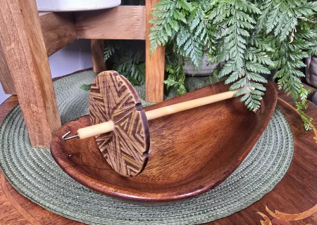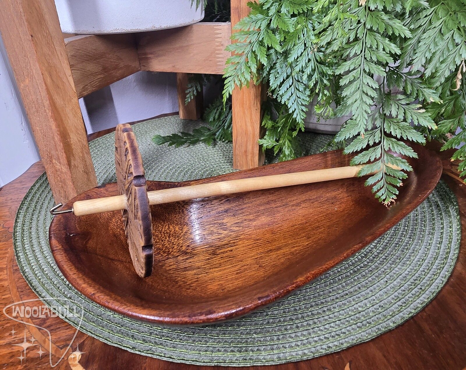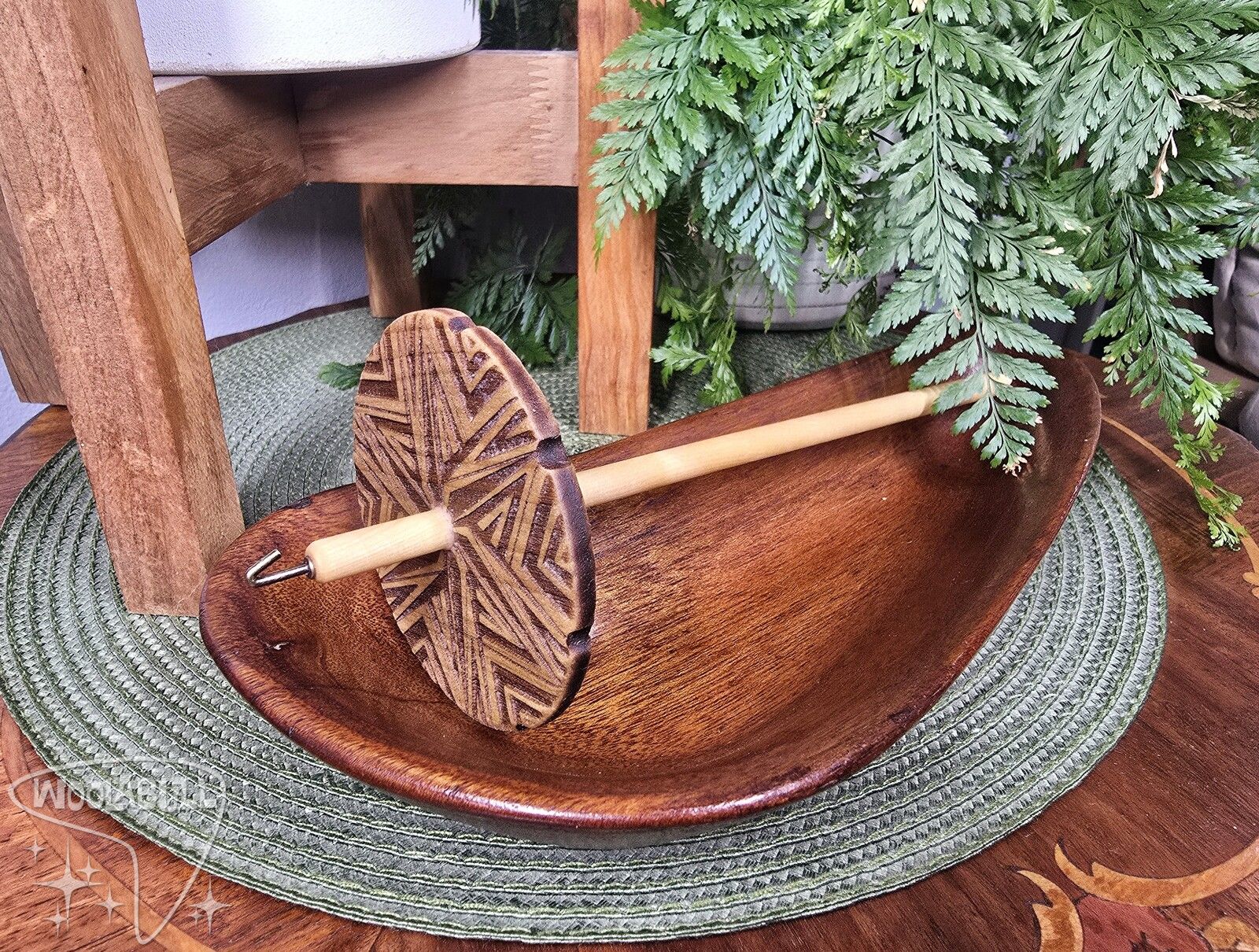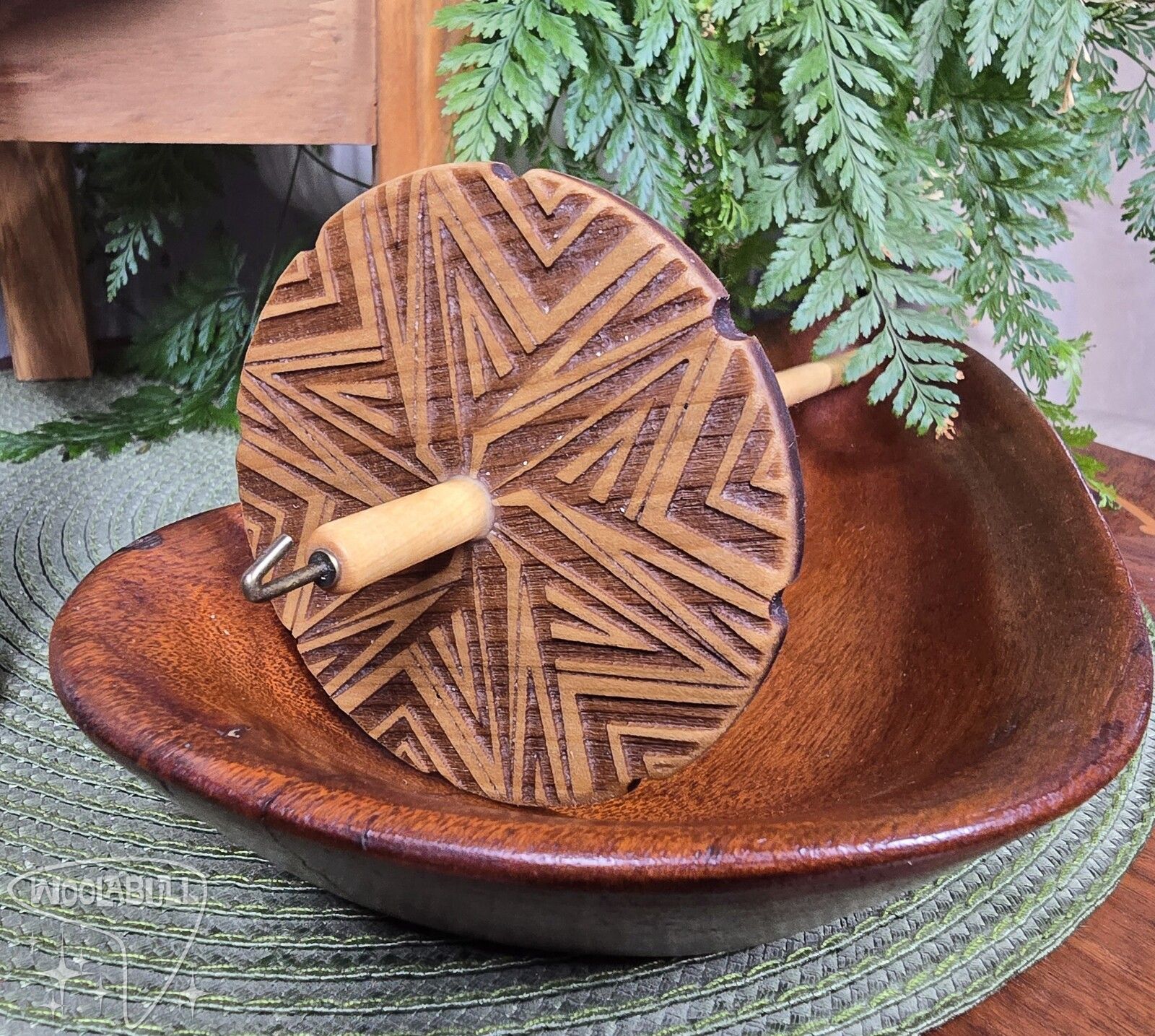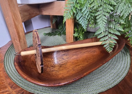 Each Drop Spindle is hand made from laser cutting my designs onto the front and back of 1/4" thick poplar wood, shaping the hardwood dowels, and shaping the hook.