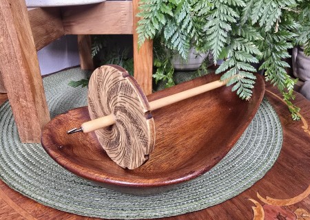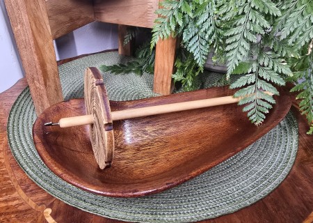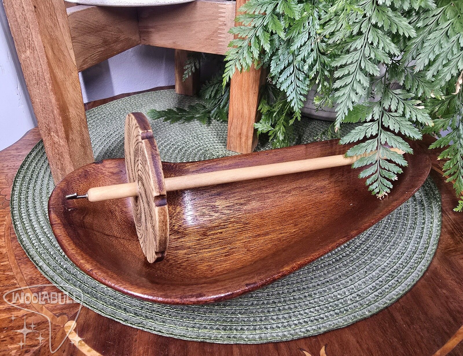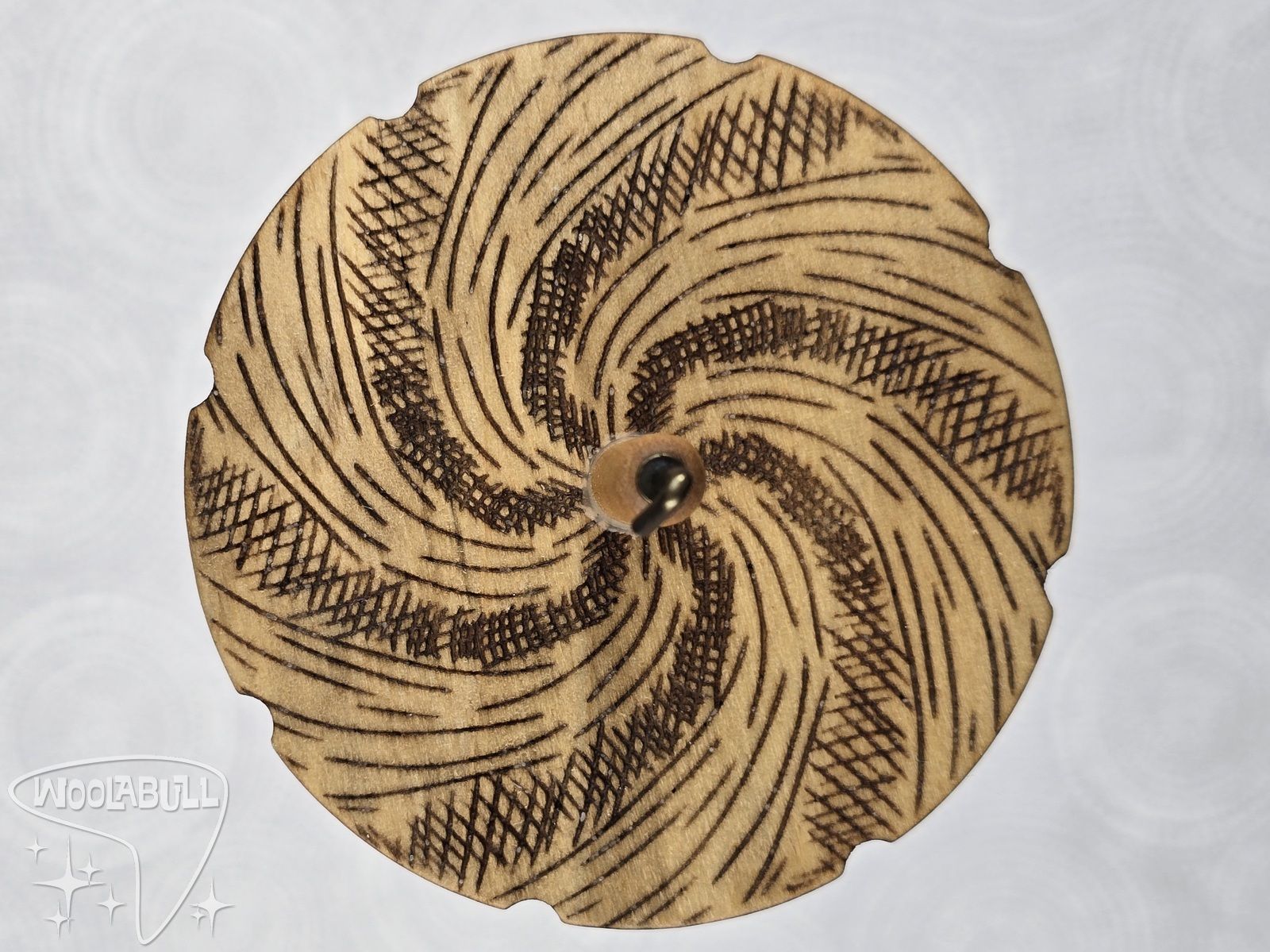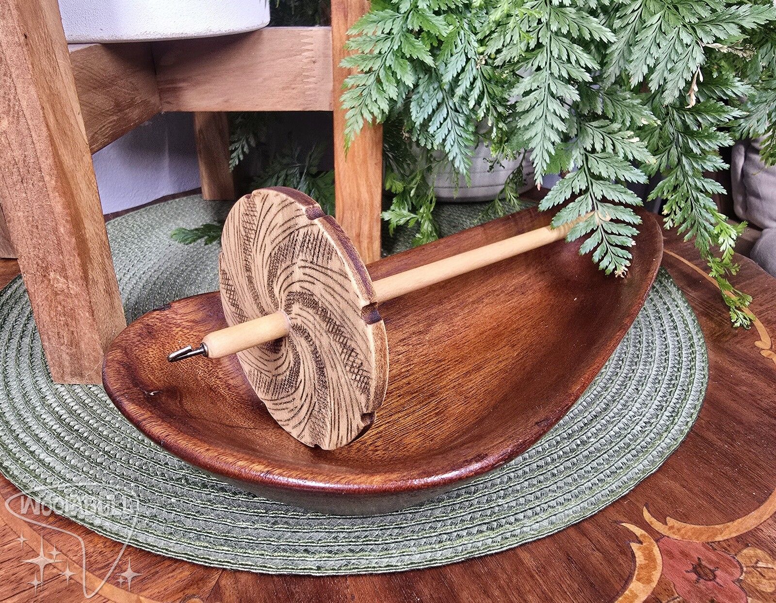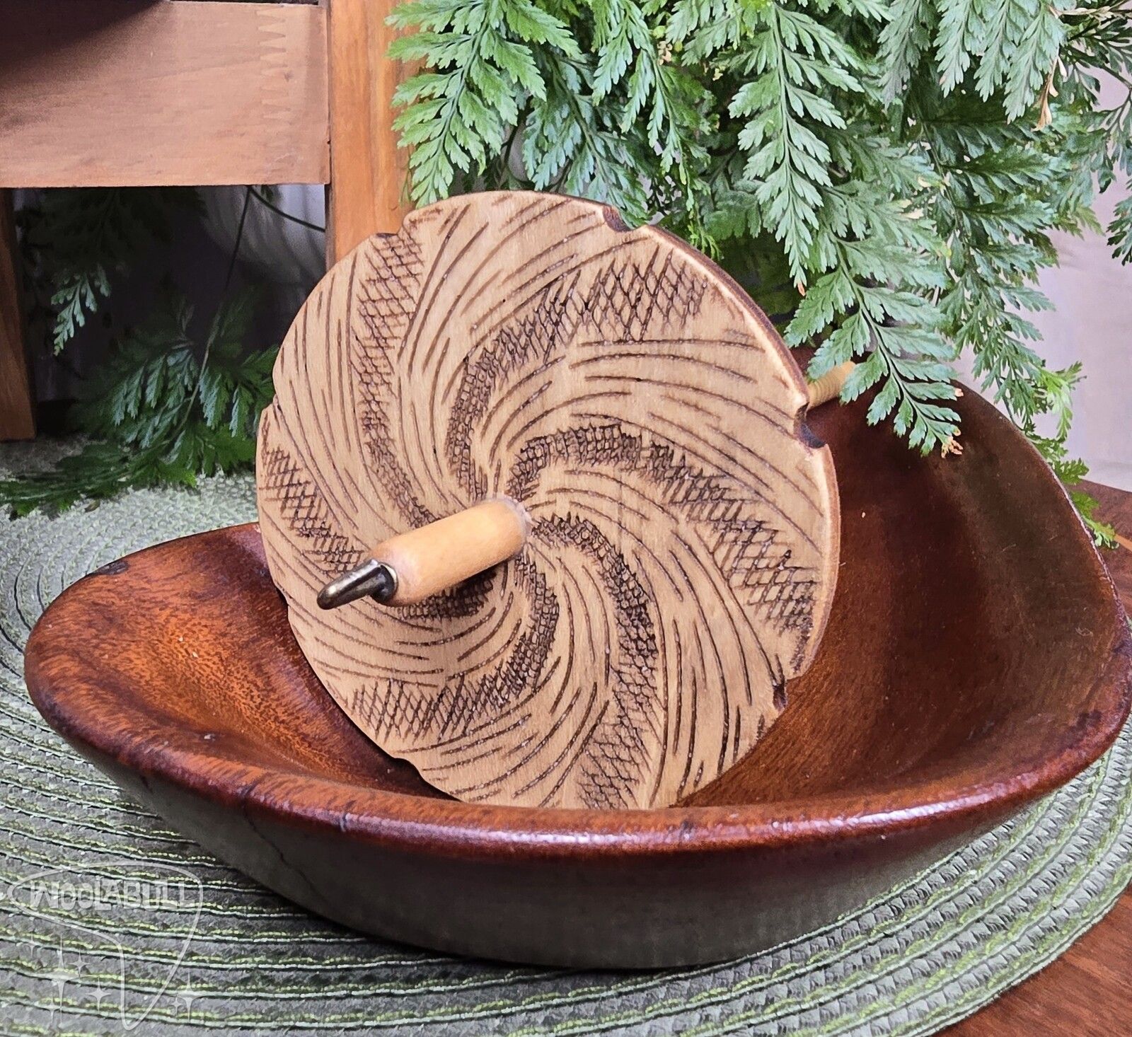 Each Drop Spindle is hand made from laser cutting my designs onto the front and back of 1/4" thick poplar wood, shaping the hardwood dowels, and shaping the hook.