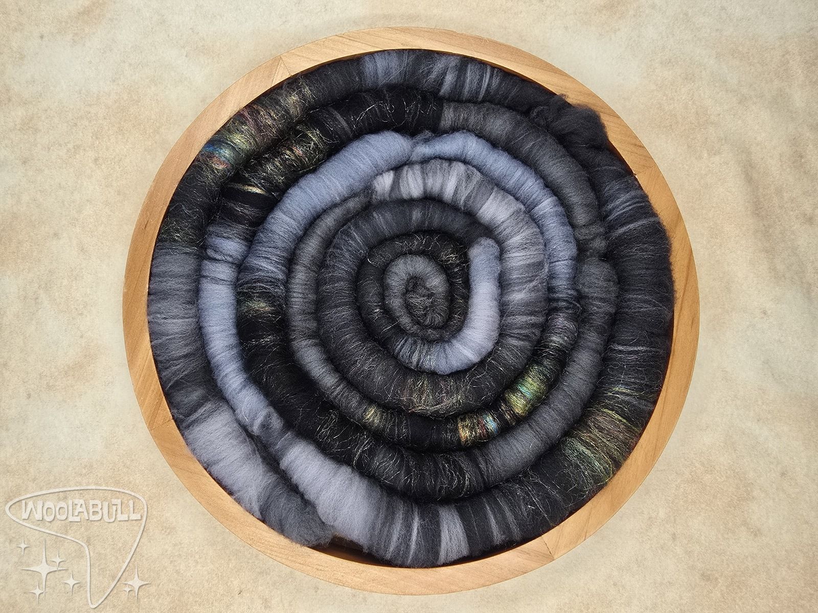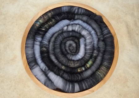 When the storm is in full gale, its always magical to see a rainbow peaking through the darkness! Merino and Shetland blend together to form the clouds, and shiny rainbow lyocell brings out the prismatic color!