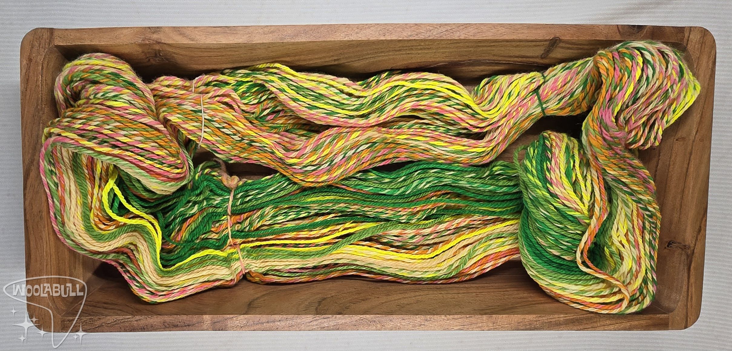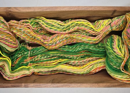 This is a super chonky hank of yarn! Summery colors blend and intermix together for a fun experience.