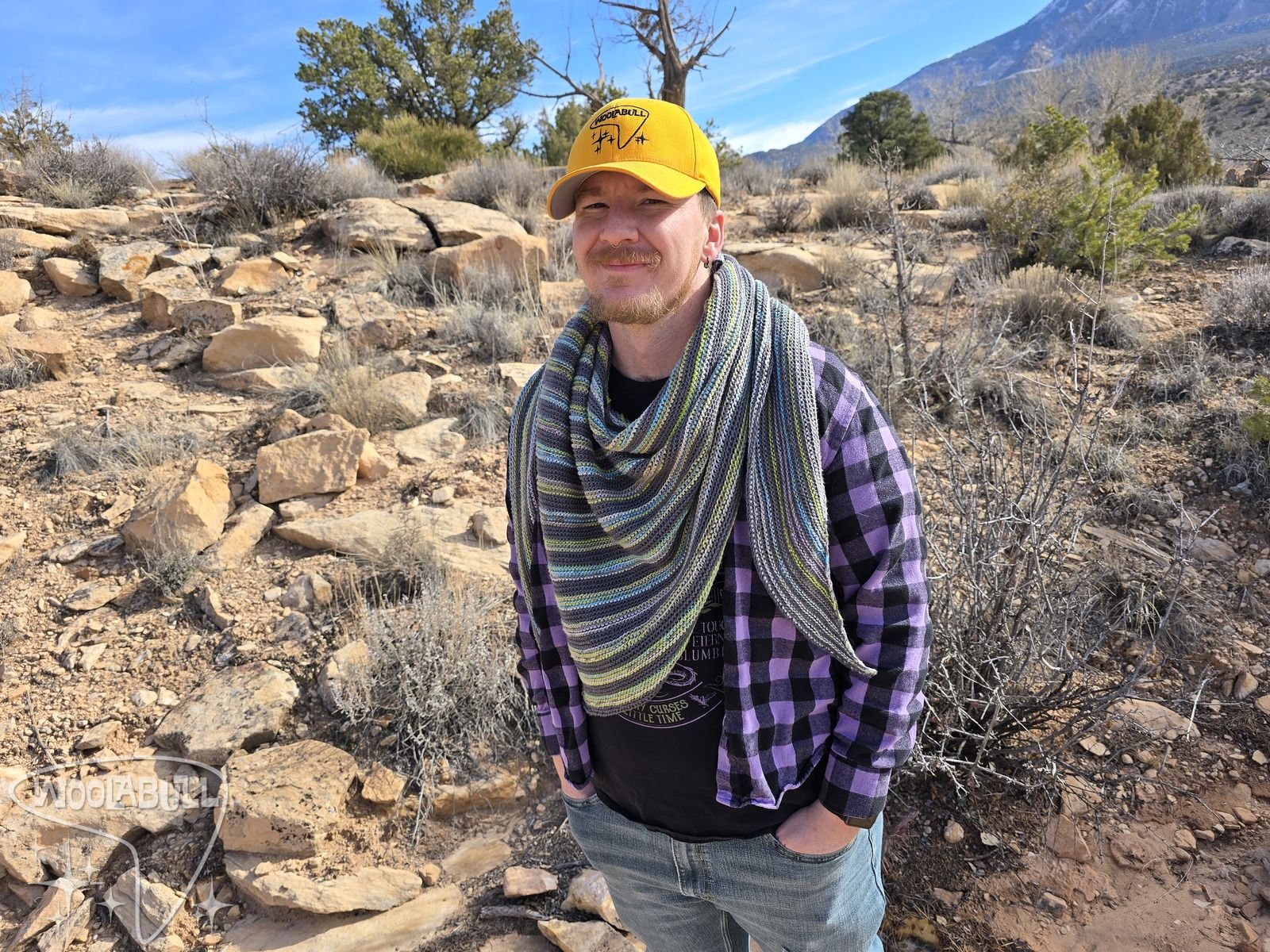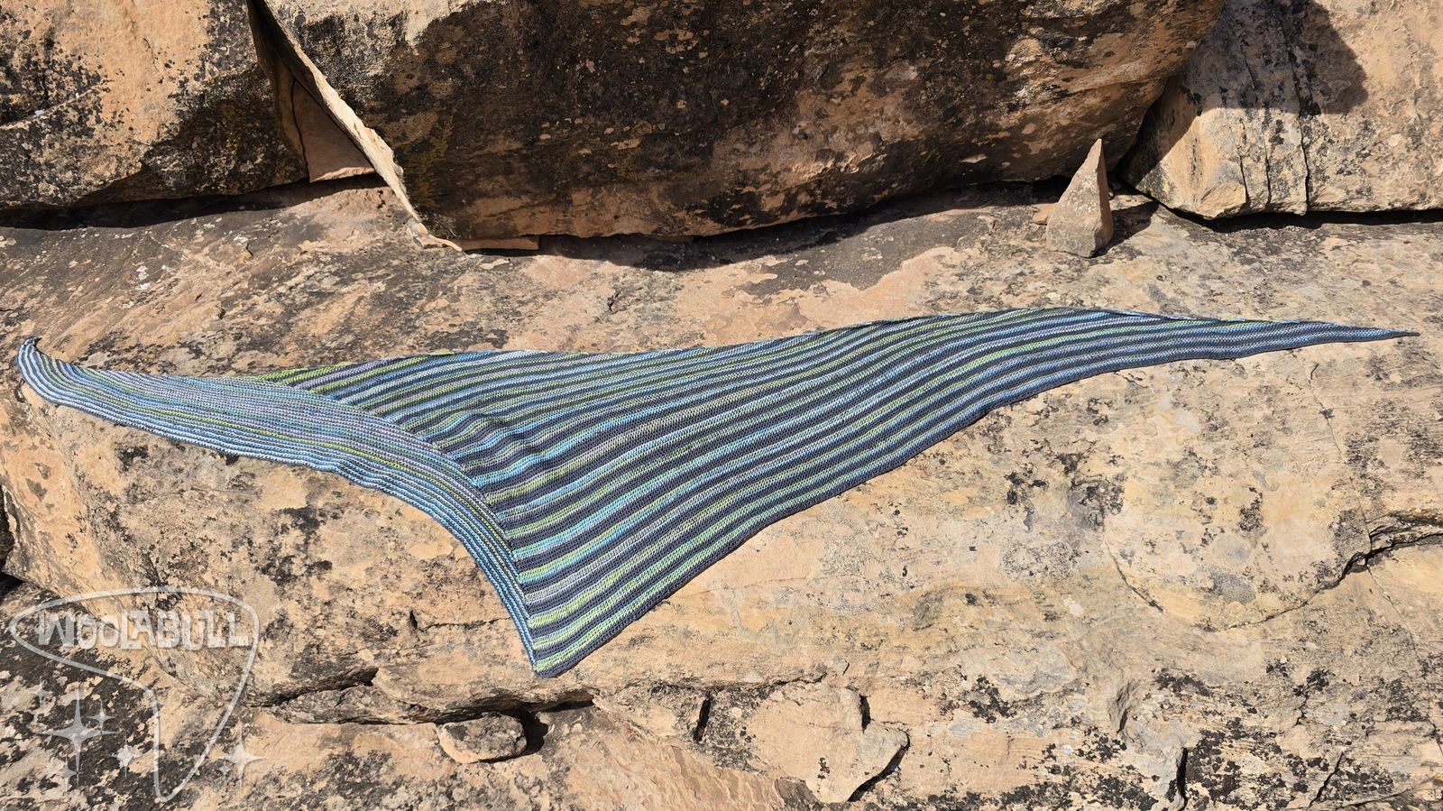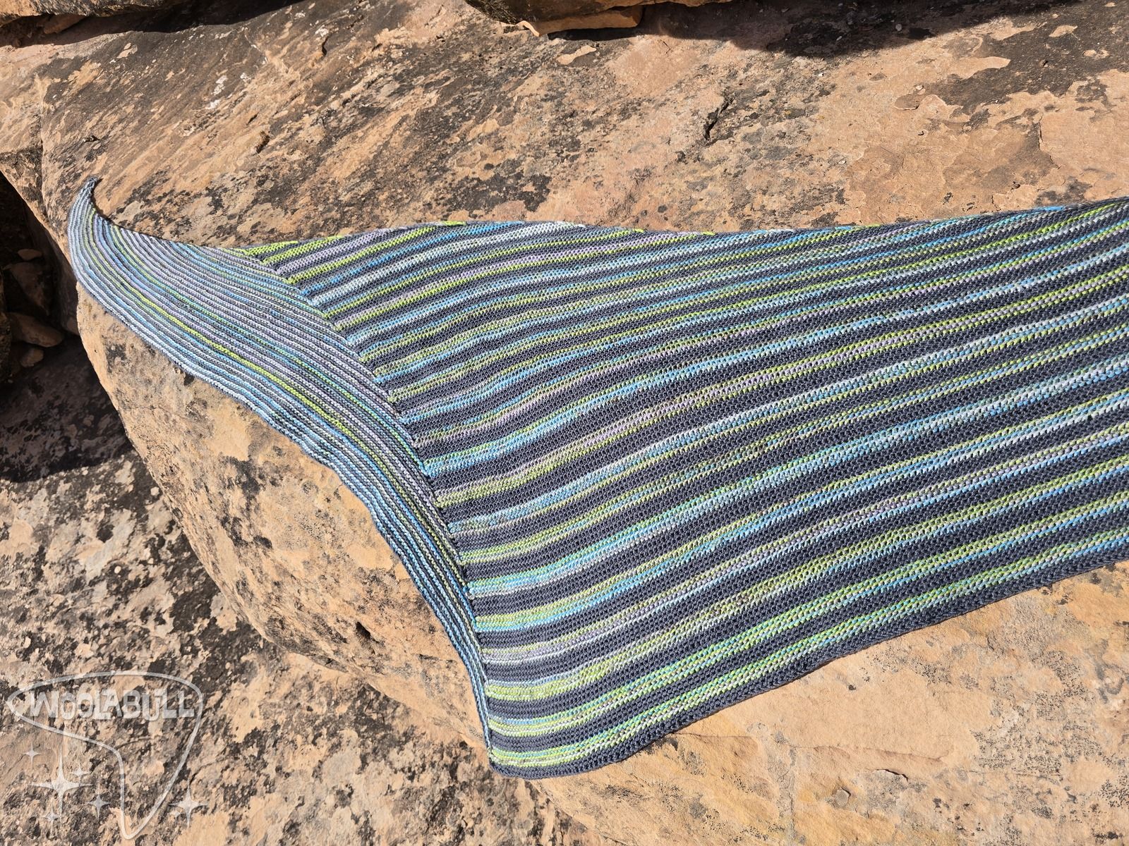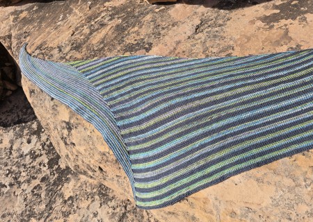 Shifting lines in rocky desert colors blend for an asymetrical shawl that is bouncy and fun to wrap up in.