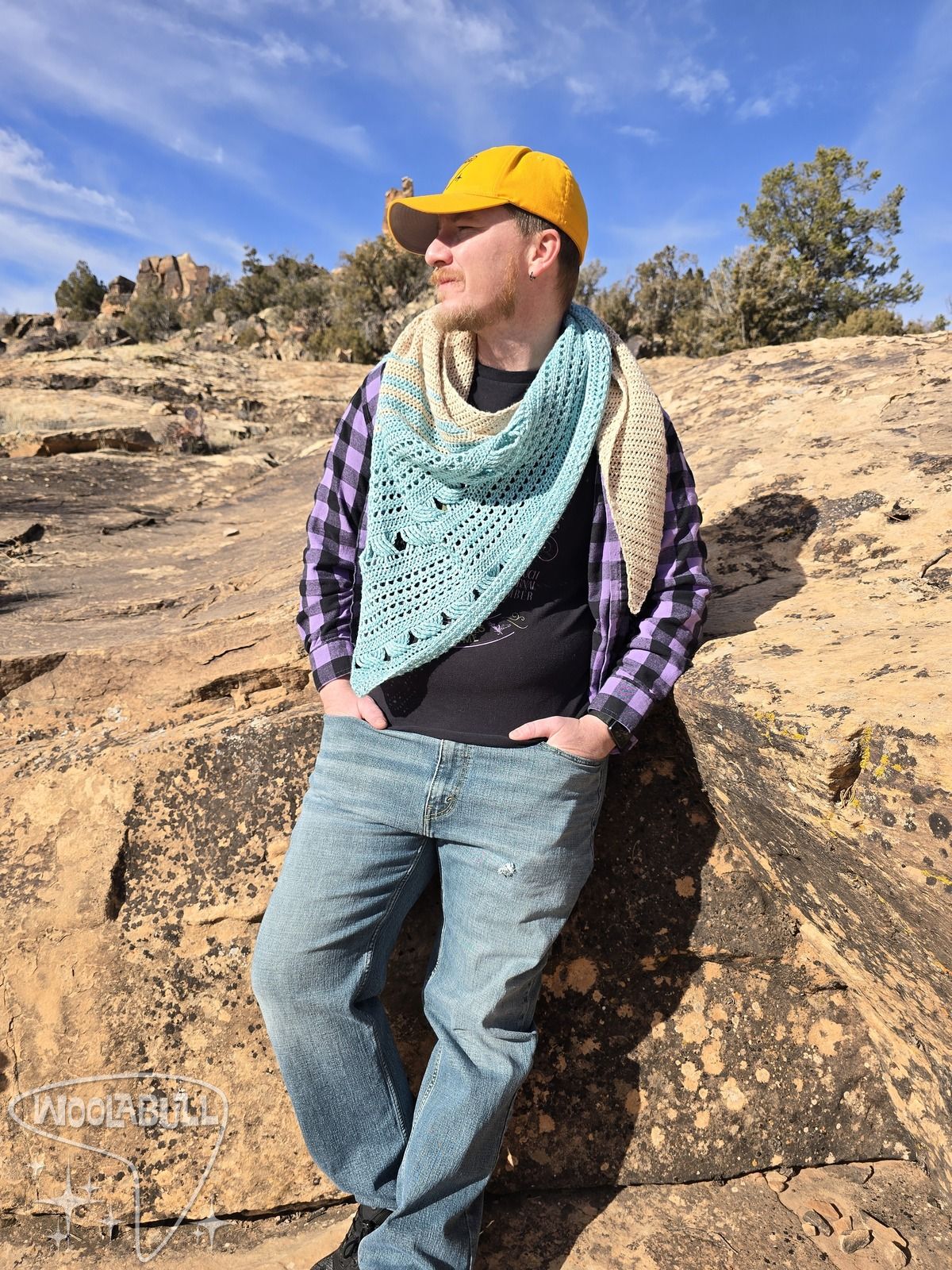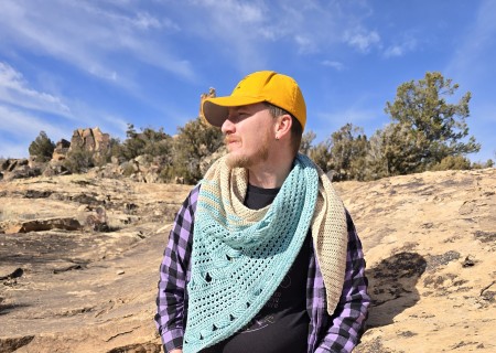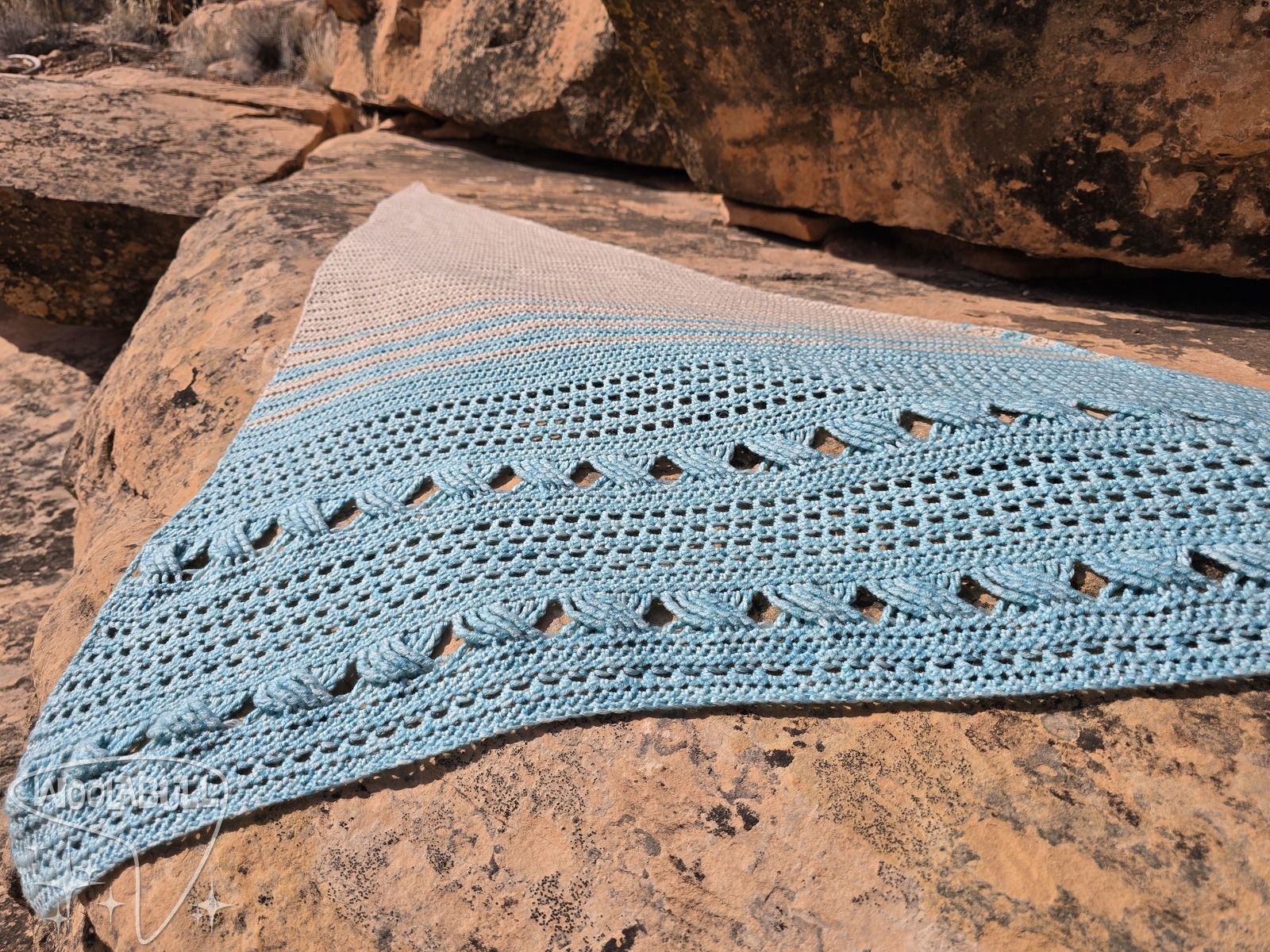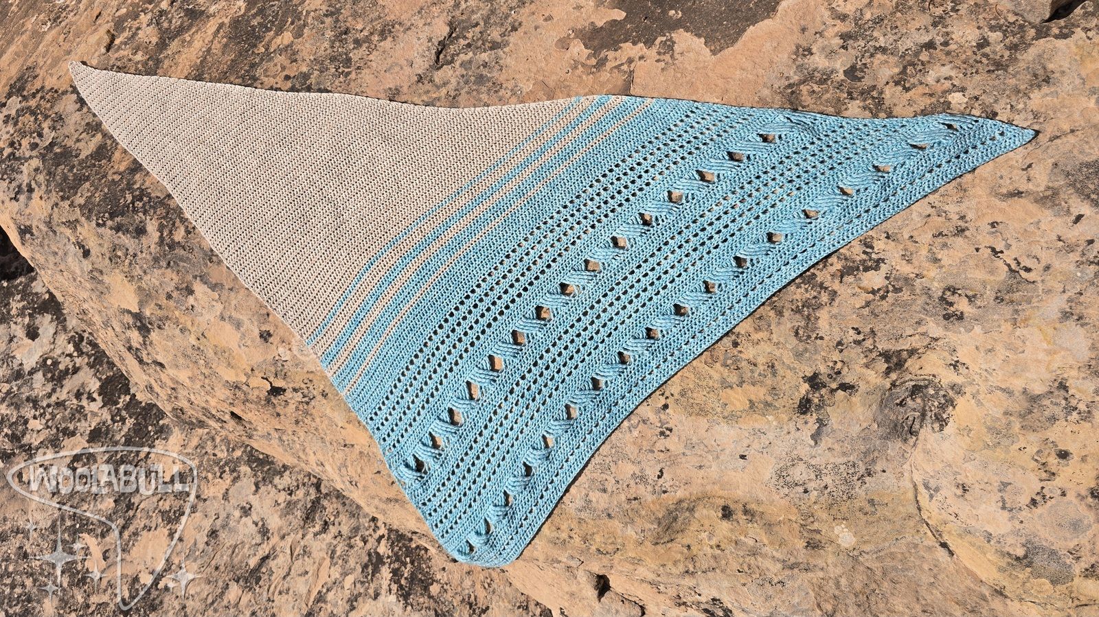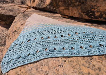 A light coastal chill will be kept at bay with this larger shawl! A light lacy design flows from the water as it washes up to the solid sand.