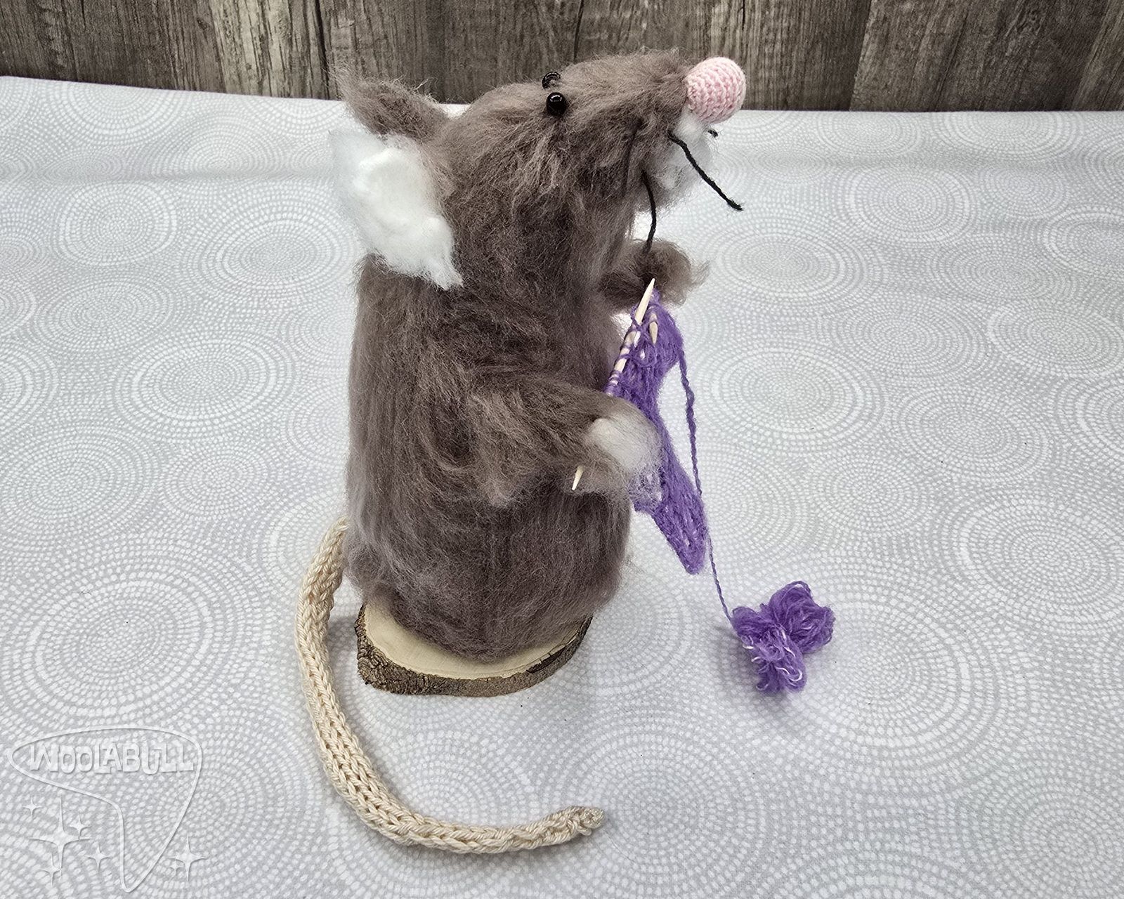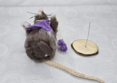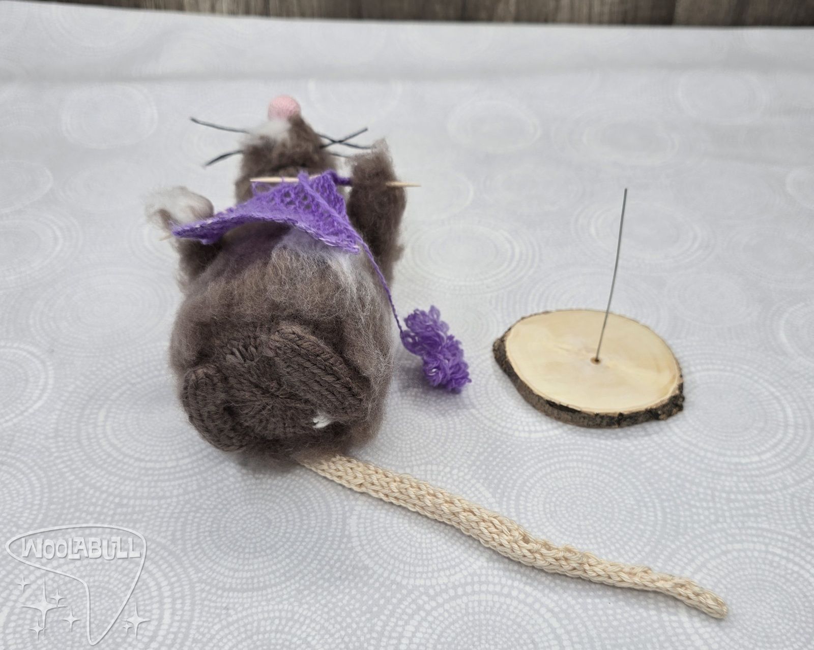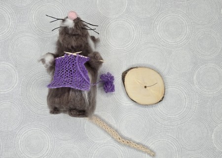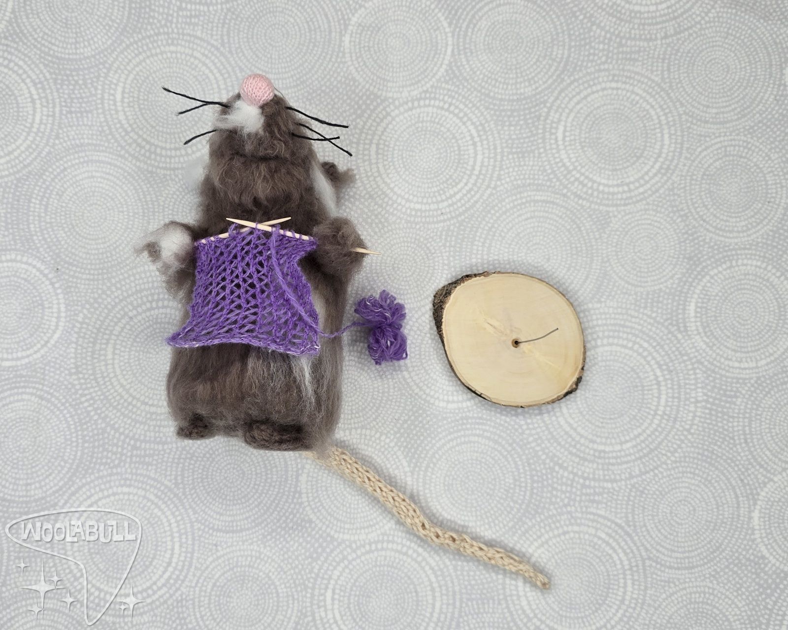 This rat is made from hand dyed, handspun nylon (faux cashmere). I then knit, and brush the daylights out of the yarn to make it fuzzy. After a quick haircut They get their little details. The nose and tail is made from mercerized cotton, their whiskers are hand dyed and spun merino, and the little eyes are seed beads.