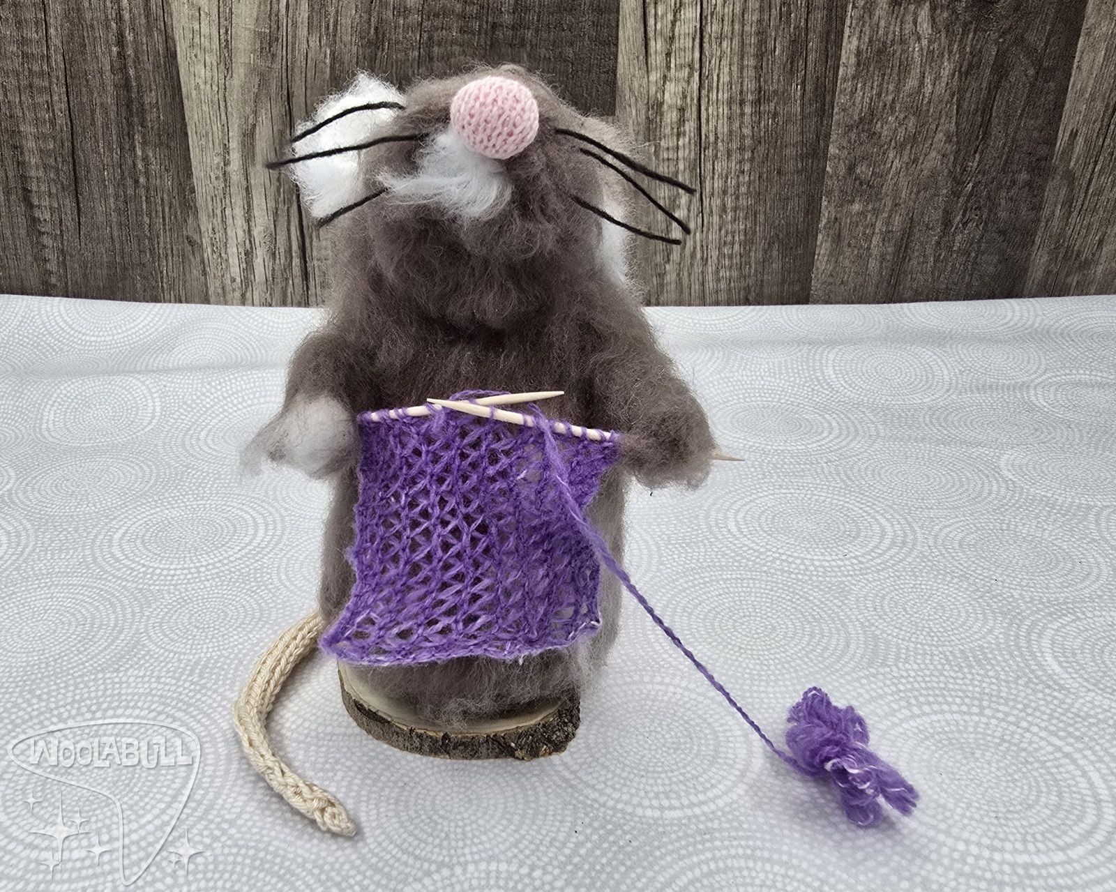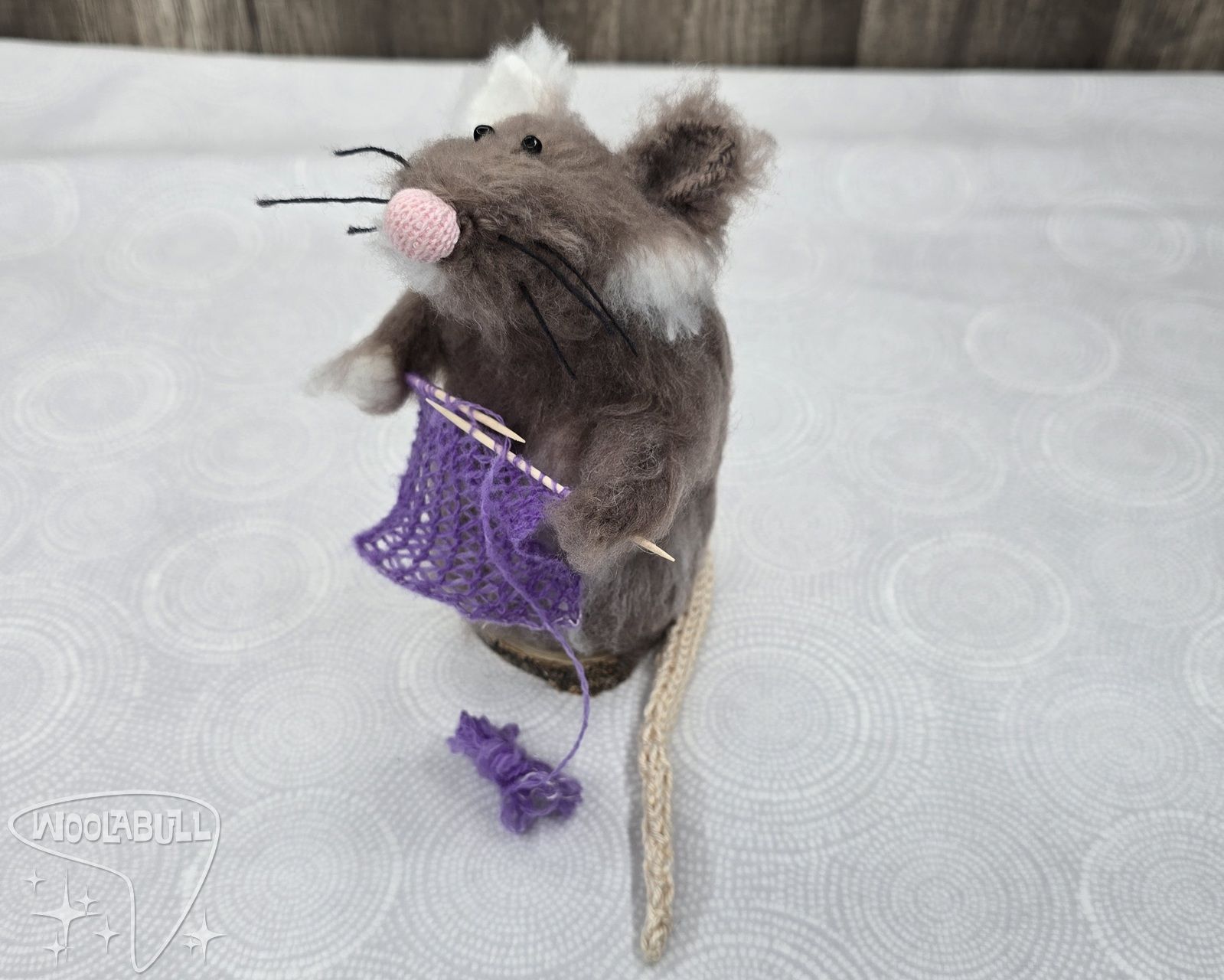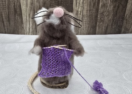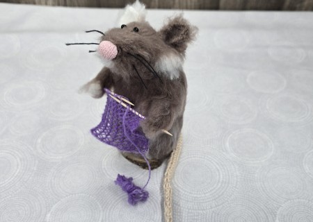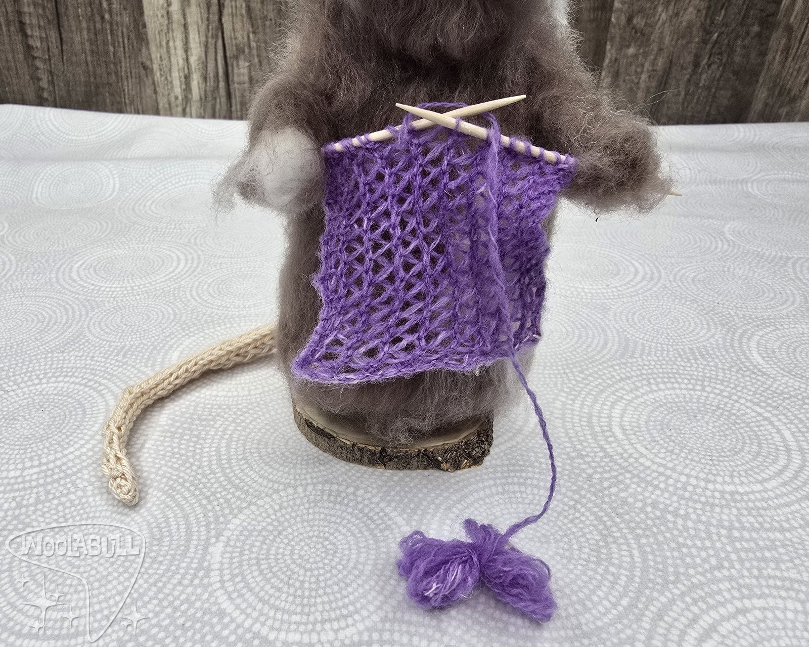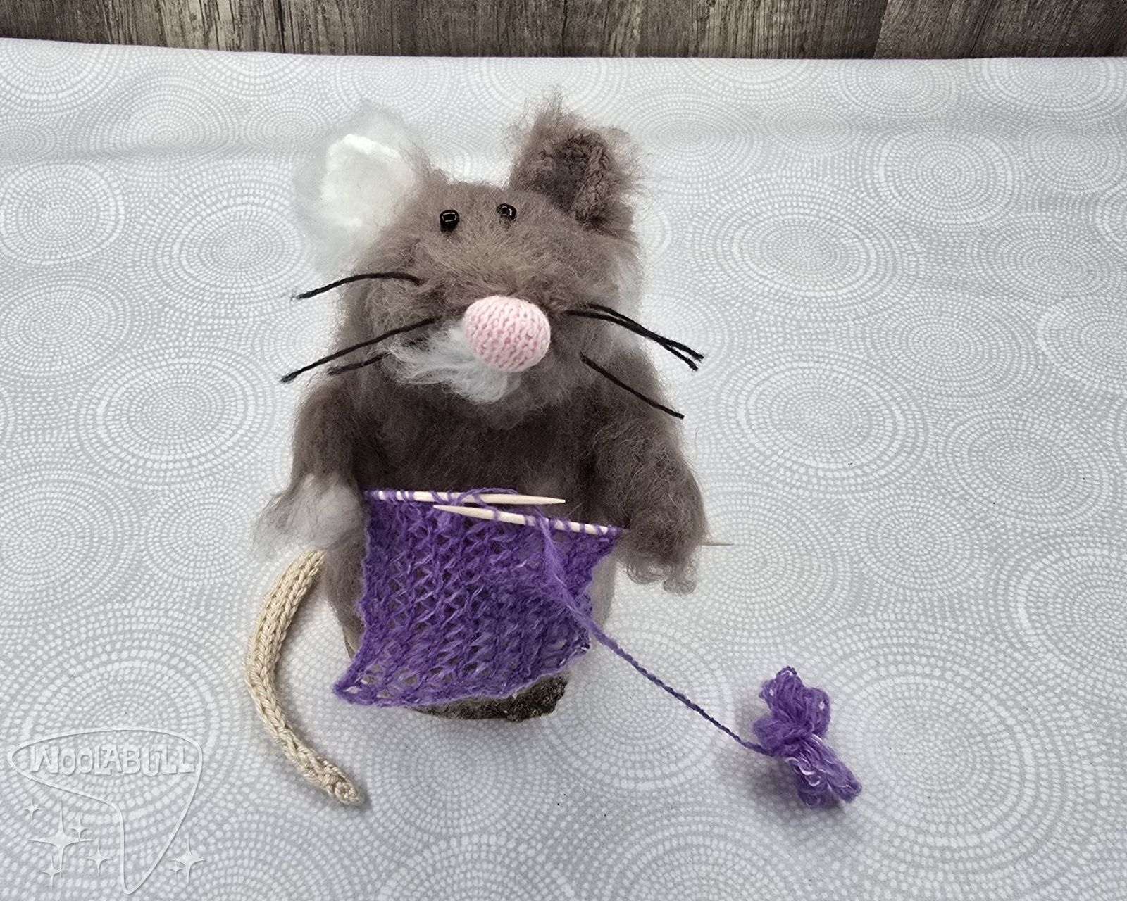 This rat is made from hand dyed, handspun nylon (faux cashmere). I then knit, and brush the daylights out of the yarn to make it fuzzy. After a quick haircut They get their little details. The nose and tail is made from mercerized cotton, their whiskers are hand dyed and spun merino, and the little eyes are seed beads.