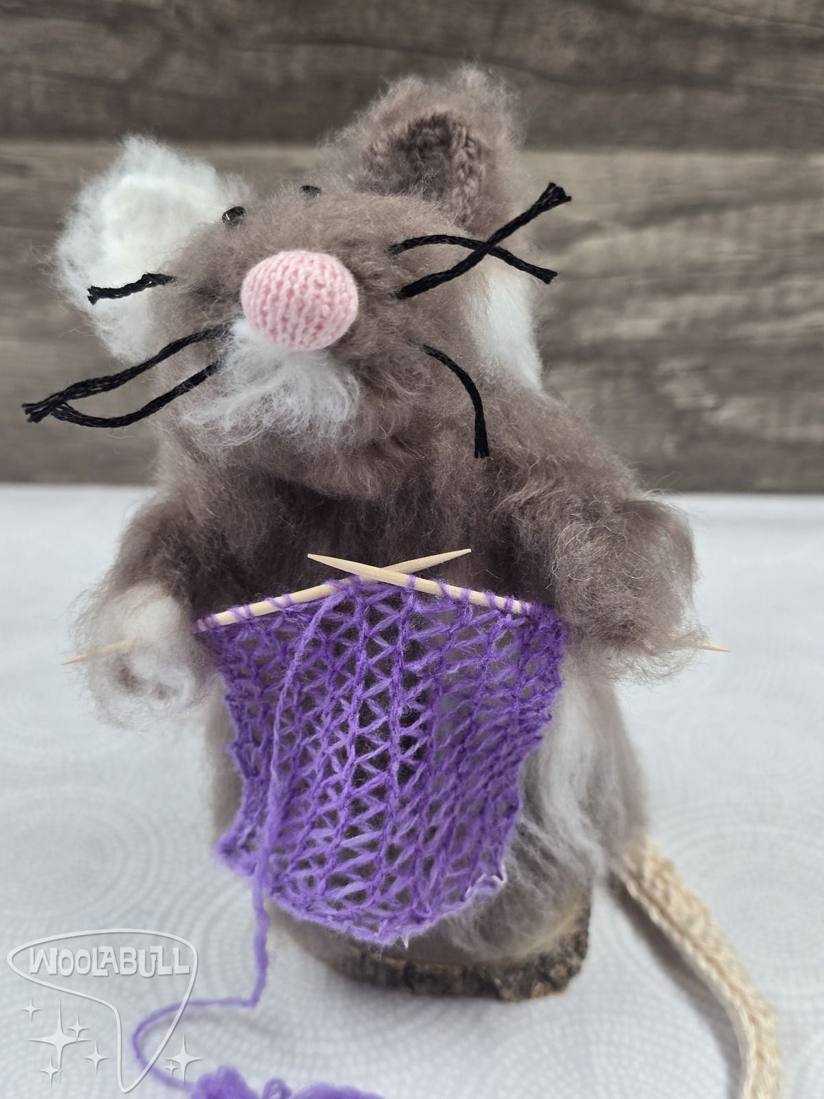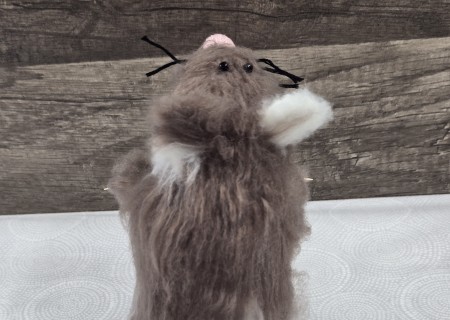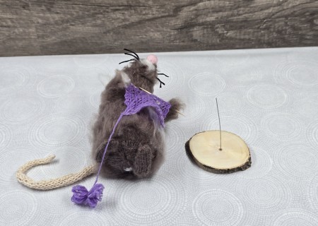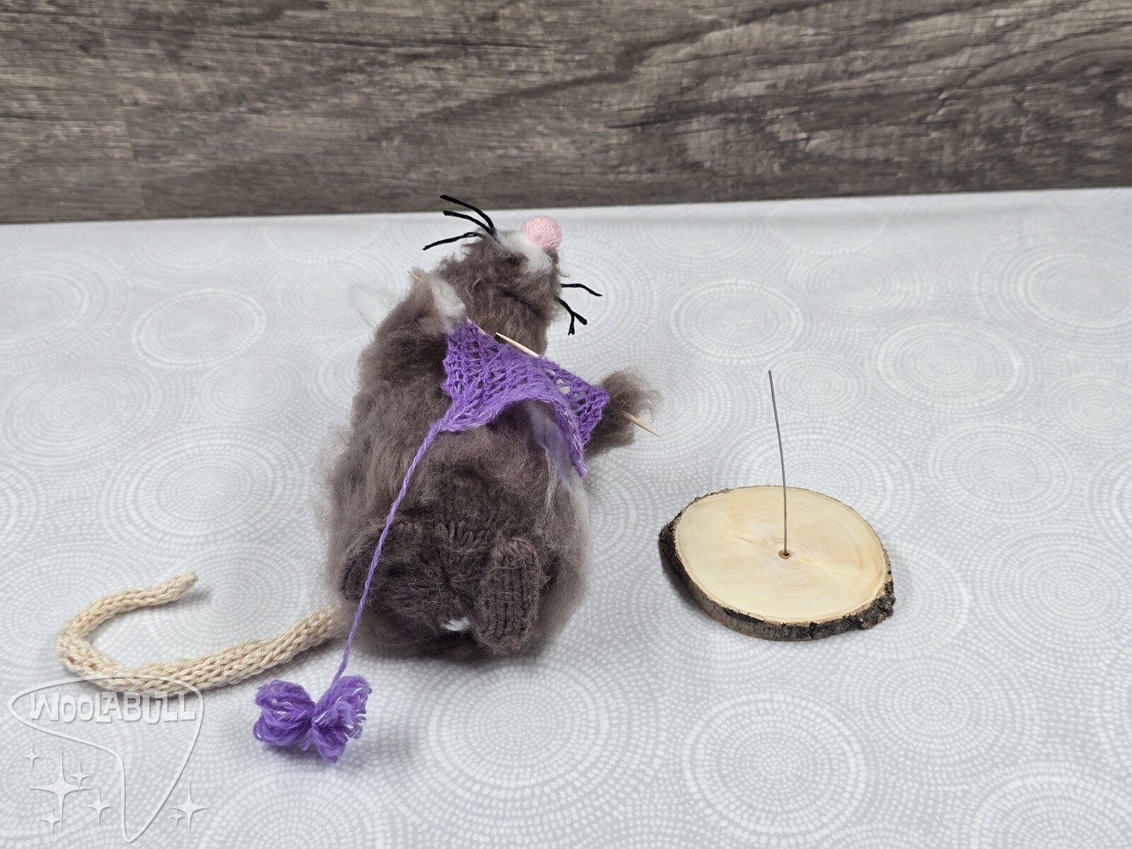 This rat is made from hand dyed, handspun nylon (faux cashmere). I then knit, and brush the daylights out of the yarn to make it fuzzy. After a quick haircut They get their little details. The nose and tail is made from mercerized cotton, and the little eyes are seed beads.