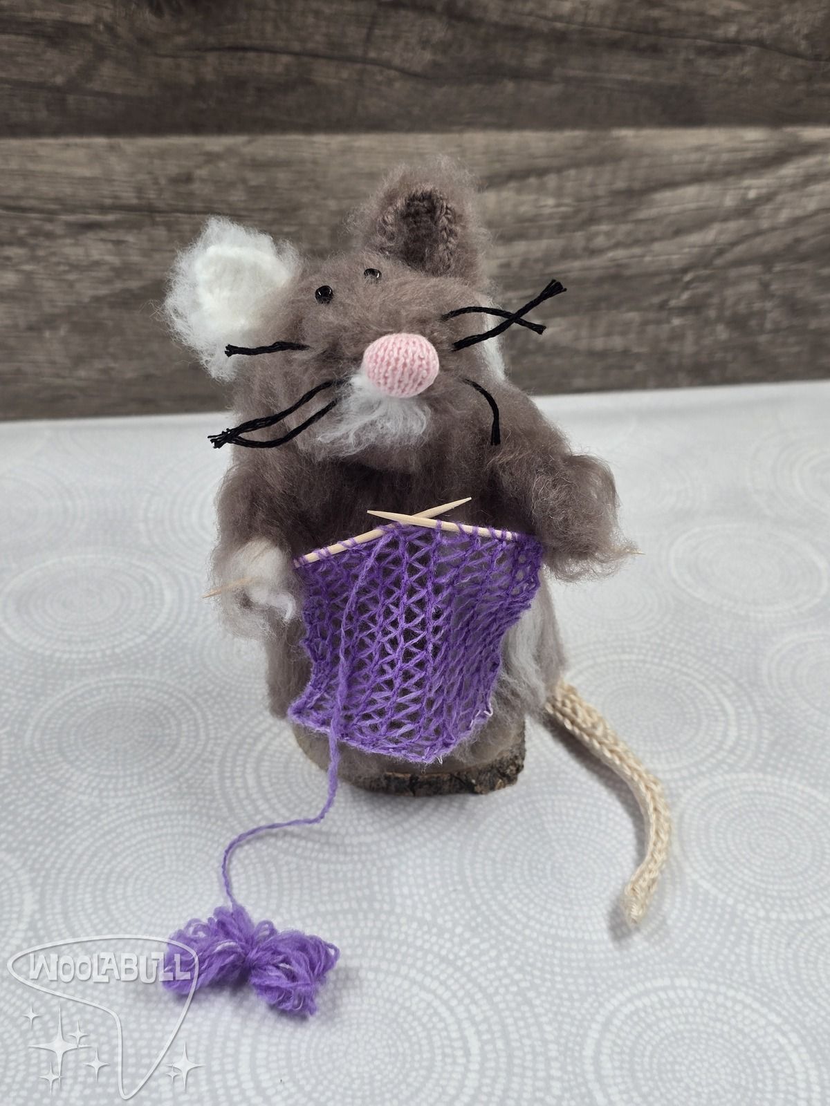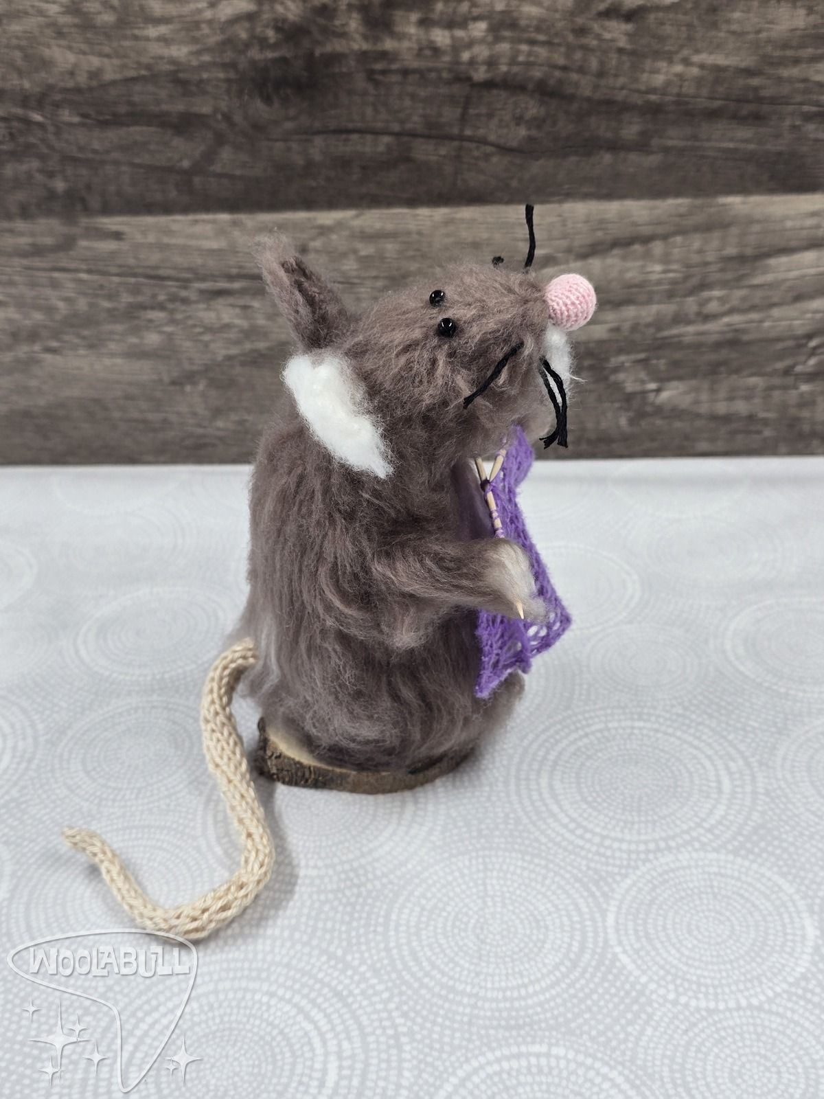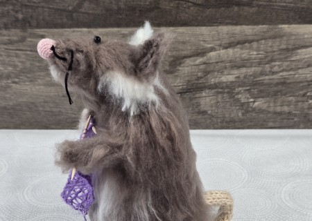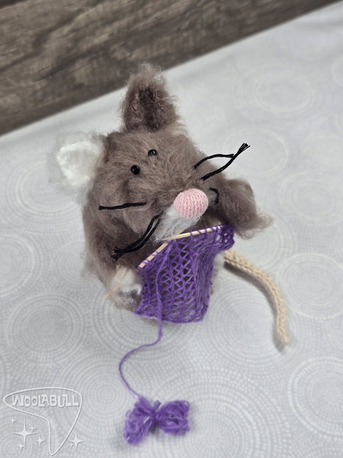 This rat is made from hand dyed, handspun nylon (faux cashmere). I then knit, and brush the daylights out of the yarn to make it fuzzy. After a quick haircut They get their little details. The nose and tail is made from mercerized cotton, and the little eyes are seed beads.