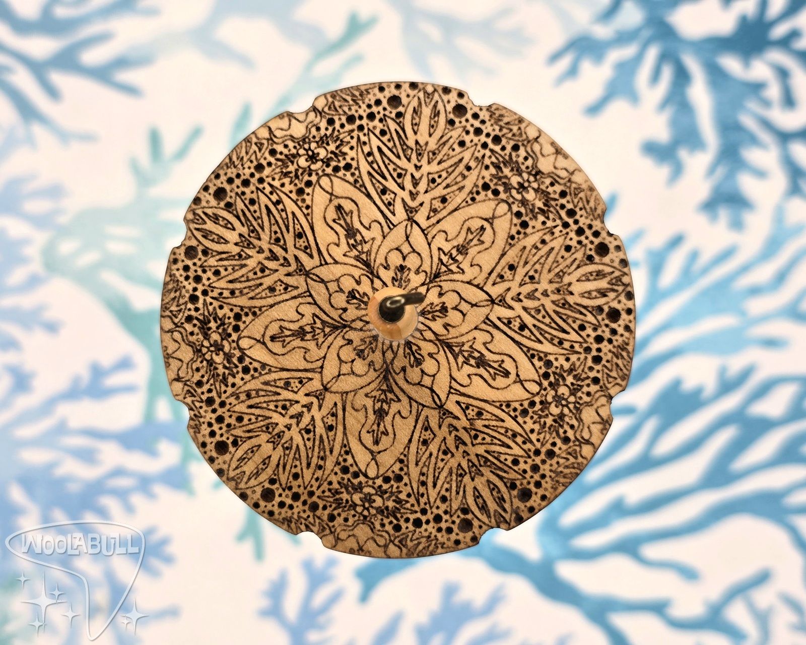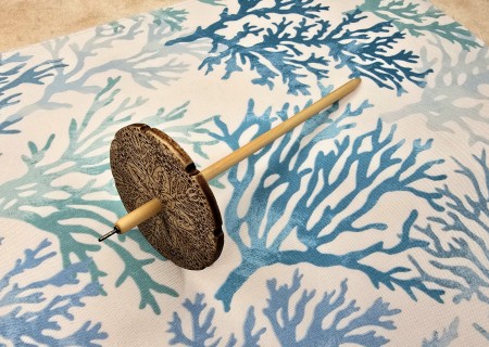 Each Drop Spindle is hand made from laser cutting my designs onto the front and back of 1/4" thick poplar wood, shaping the hardwood dowels, and shaping the hook.