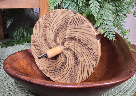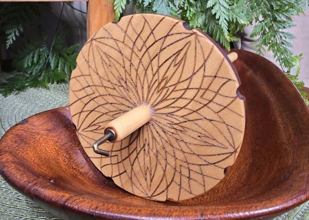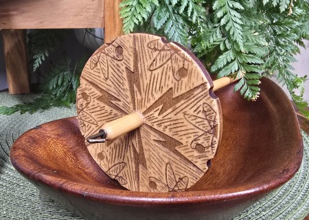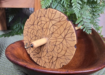 Careful to not get caught up in its pull! This sketch design looks great in motion as you spin up something fluffy to warm yourself up with!.Each Drop Spindle is hand made from laser cutting my designs onto the front and back of 1/4" thick poplar woo...