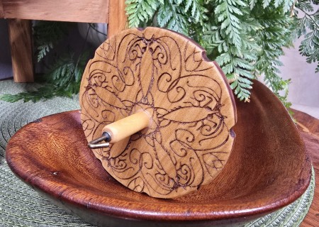 The layered scales of the Draig (Welsh for Dragon) will shimmer as you spin up something fluffy to enjoy with your fiery friend! Each Drop Spindle is hand made from laser cutting my designs onto the front and back of 1/4" thick poplar wood, shaping t...